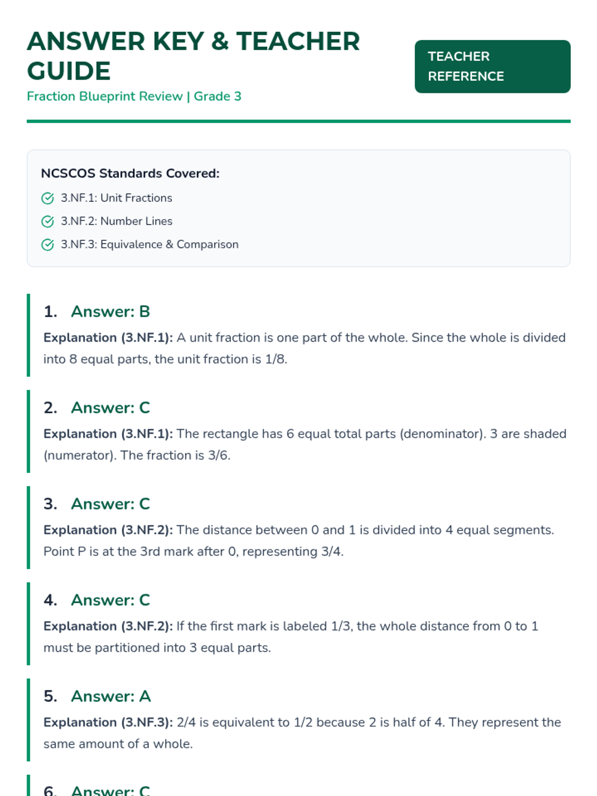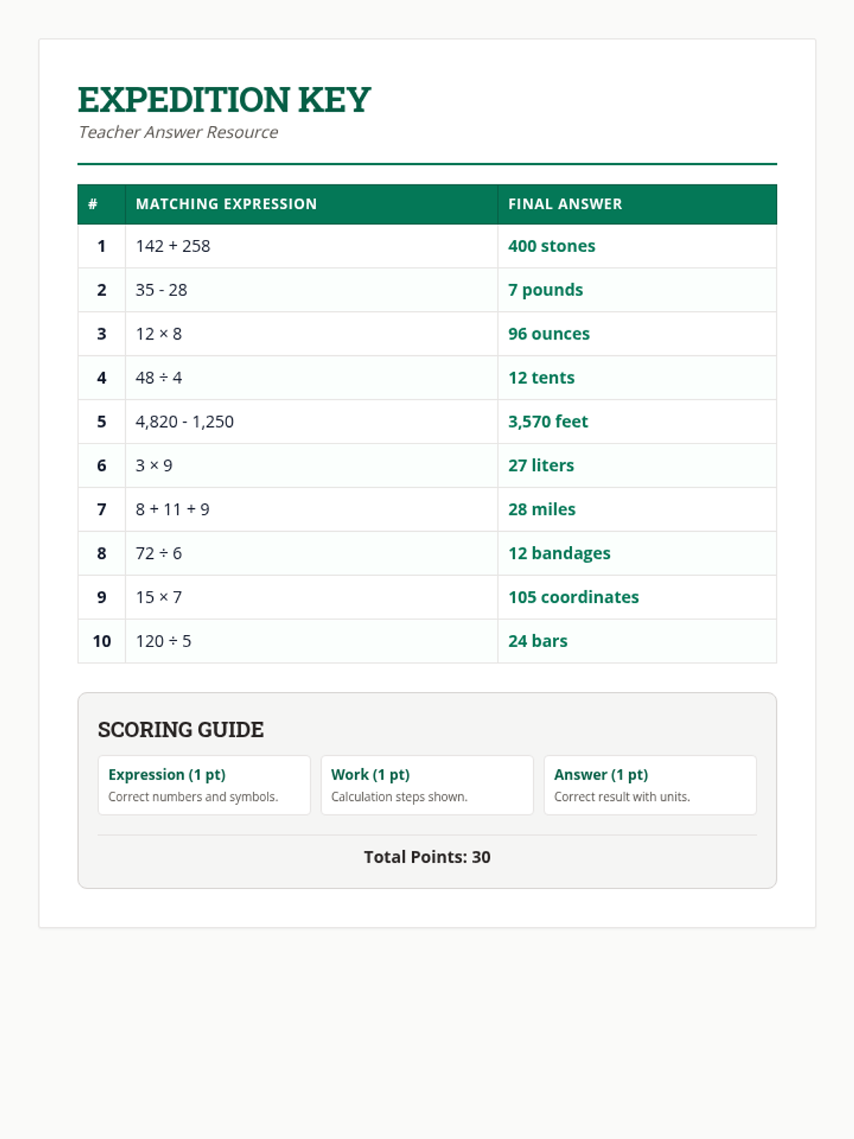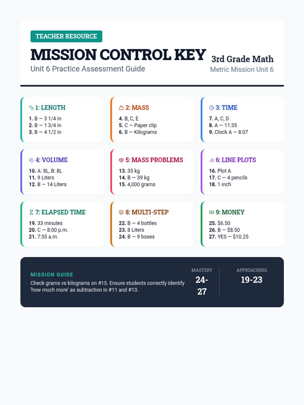 Teacher-facing answer key for the Power Practice Packet, providing correct answers, exemplar responses, and scoring guidelines for the 3rd-grade math standards covered. Updated with vertical equations for Q5-6 and visual diagrams for Q1-2. Optimized layout to prevent orphaned headers.