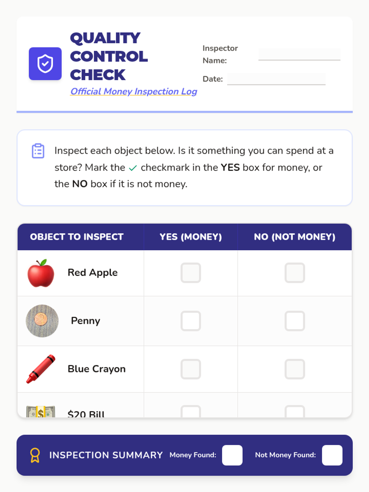 A "Quality Control Check" checklist worksheet where students evaluate various household items and food alongside currency to identify if they are money, using real photos for coins.