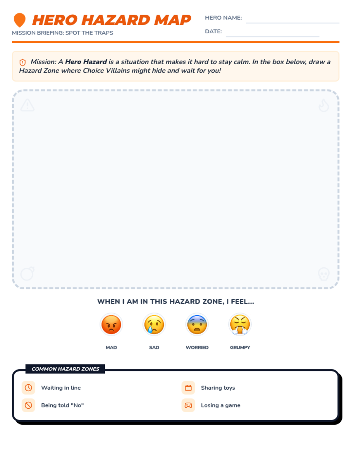 A student-facing worksheet designed to help kids identify and draw situational triggers ("Hero Hazards") where they might experience big feelings and encounter Choice Villains. Improved layout to fit on one page with clear emotion labels.