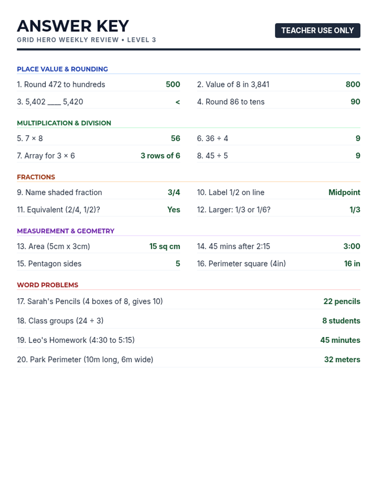 Teacher's answer key for the Grid Hero Weekly Review. Revised to fit on a single page with high-contrast text.
