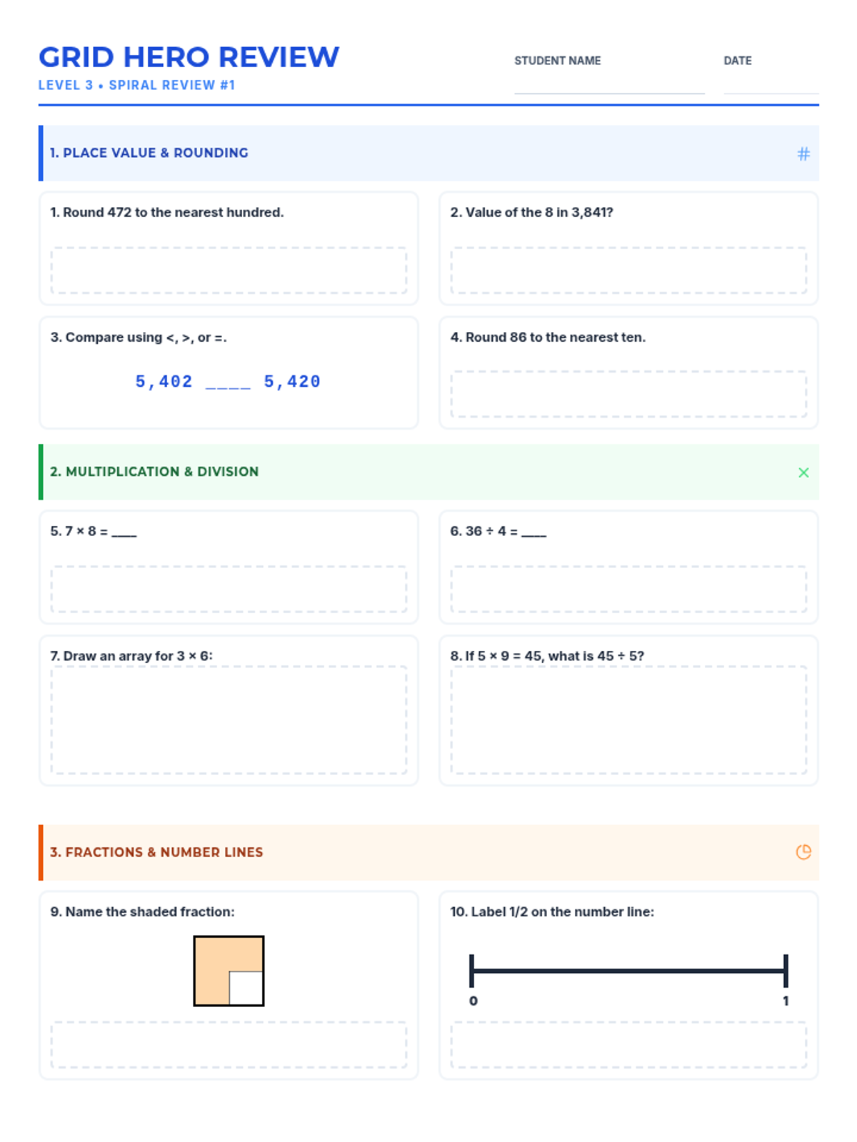 A 20-question comprehensive math spiral review for third grade students, covering all major domains. Consistently uses white work areas and robust layout to ensure printability. Revised to ensure a strict 2-page fit and removed LaTeX to ensure rendering.