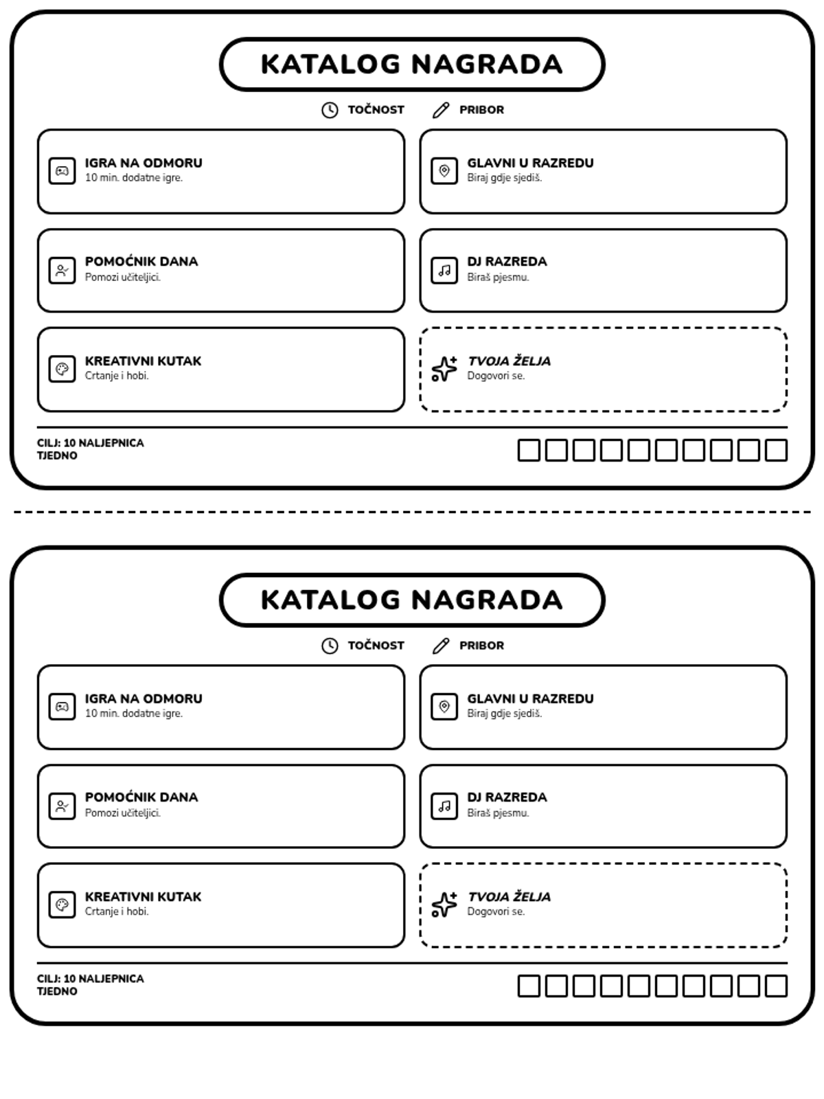 Katalog nagrada u manjem formatu (2 na jednoj stranici). Sadrži vizualne ikone, opise nagrada i povezana ponašanja. Crno-bijeli dizajn visokog kontrasta s integriranim brojačem.