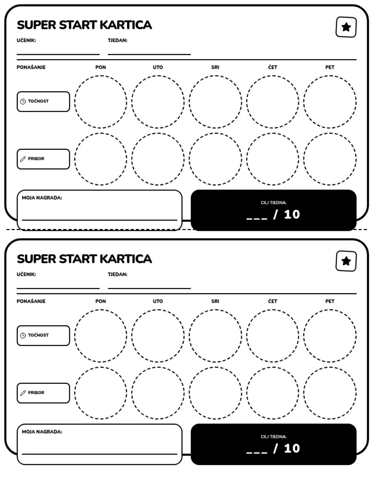 Tjedna kartica za žetoniranje u manjem formatu (2 na jednoj stranici). Sadrži polja za naljepnice za točnost i pribor. Crno-bijeli dizajn visokog kontrasta s ispravljenim poravnanjem i povećanim radnim prostorom.