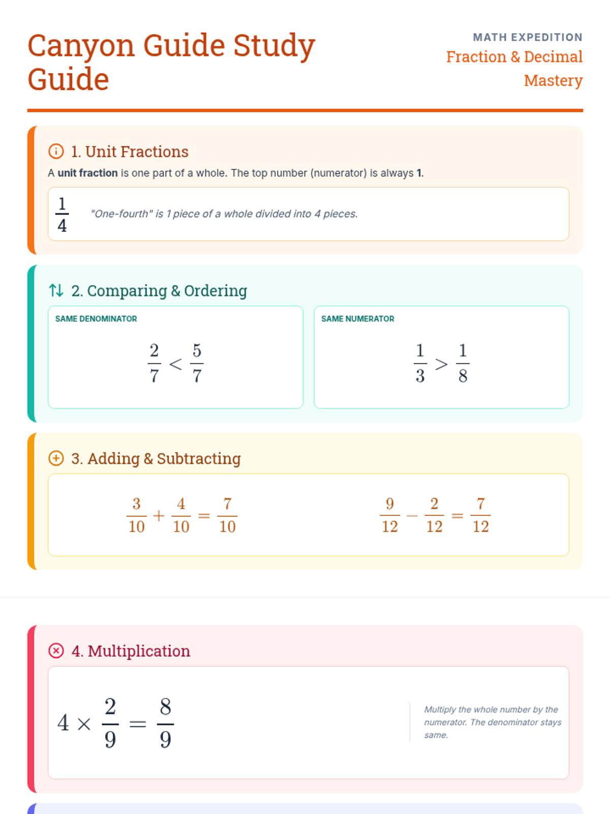 A visual study guide with clear examples and tips for identifying unit fractions, ordering fractions, fraction arithmetic, and decimal operations.