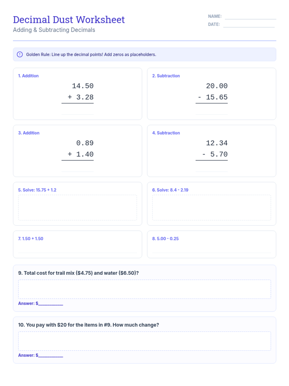 A worksheet focused on decimal arithmetic, containing 10 problems (6 vertical/horizontal and a multi-step word problem) on adding and subtracting decimals.