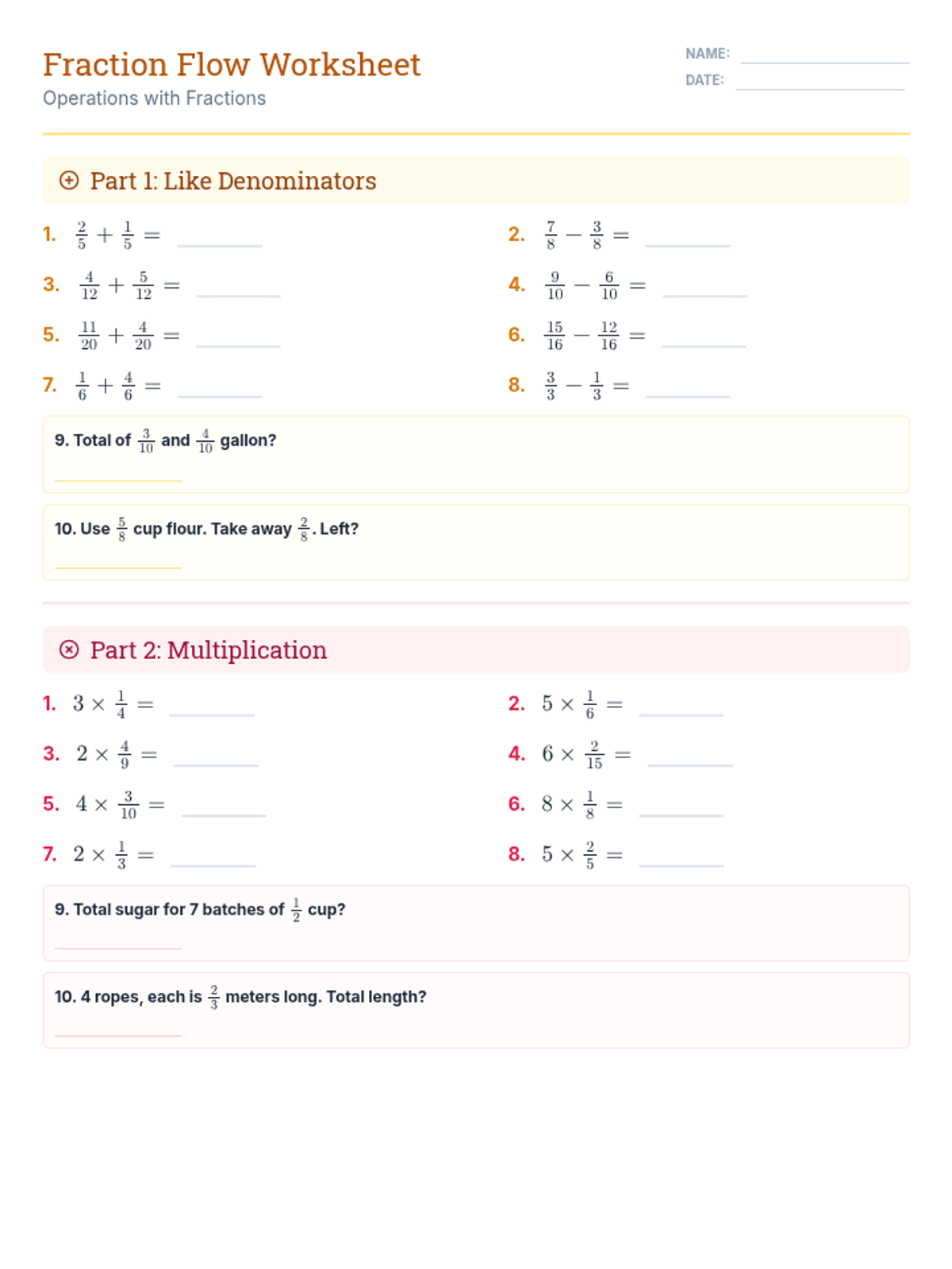 A worksheet containing 10 addition and subtraction problems with like denominators and 10 multiplication problems involving whole numbers and fractions.