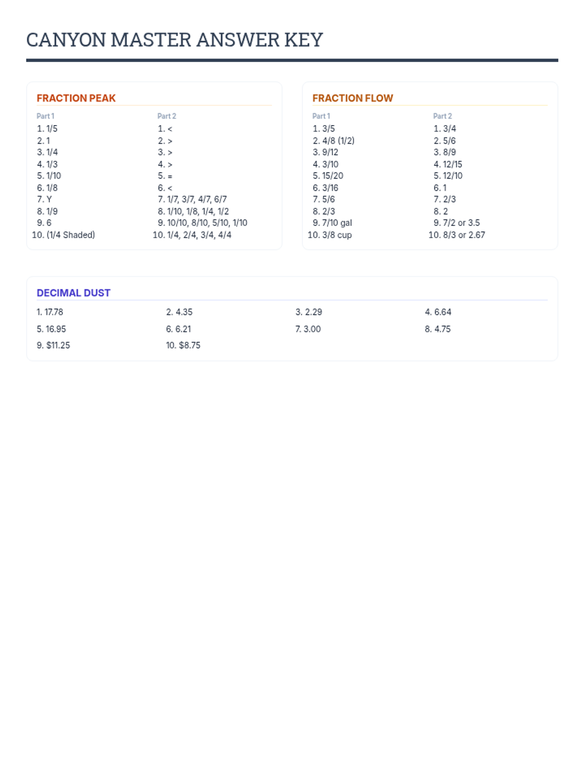 Teacher answer key for all worksheets in the Calculation Canyon review packet.