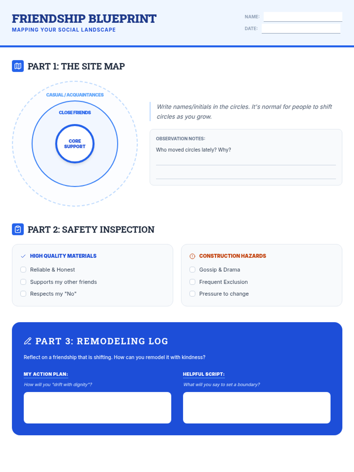 A comprehensive worksheet for students to map their social circles, identify healthy versus hazardous friendship traits, and reflect on personal social transitions with an architect-themed design.