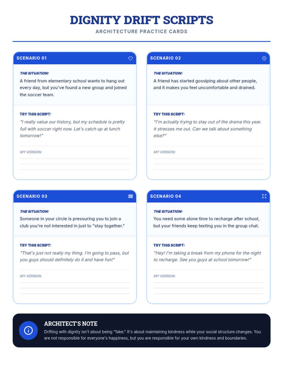 A set of roleplay practice cards providing students with 'drifting with dignity' scripts for common 6th-grade social scenarios, designed to build boundary-setting skills with kindness.