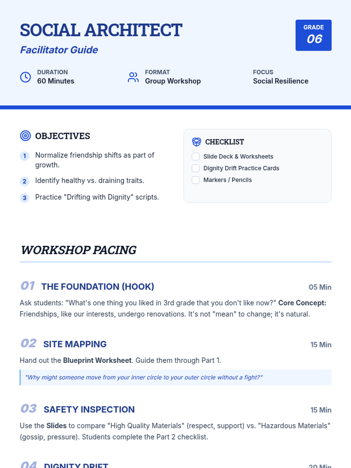 A detailed facilitator guide for the Social Architect workshop, featuring learning objectives, a materials checklist, and a clearly paced instructional sequence for educators.