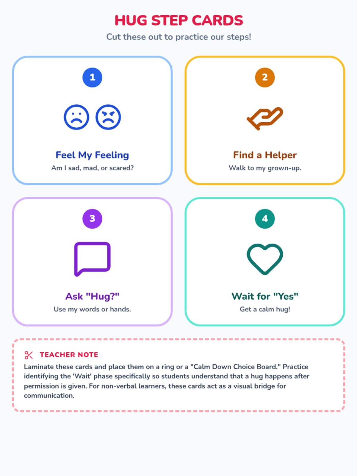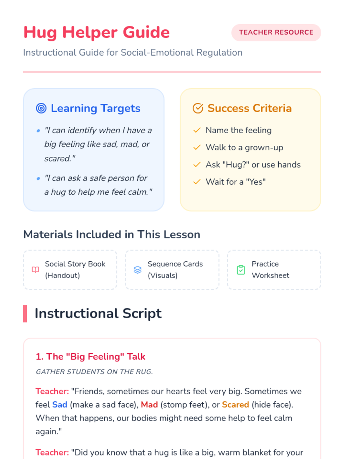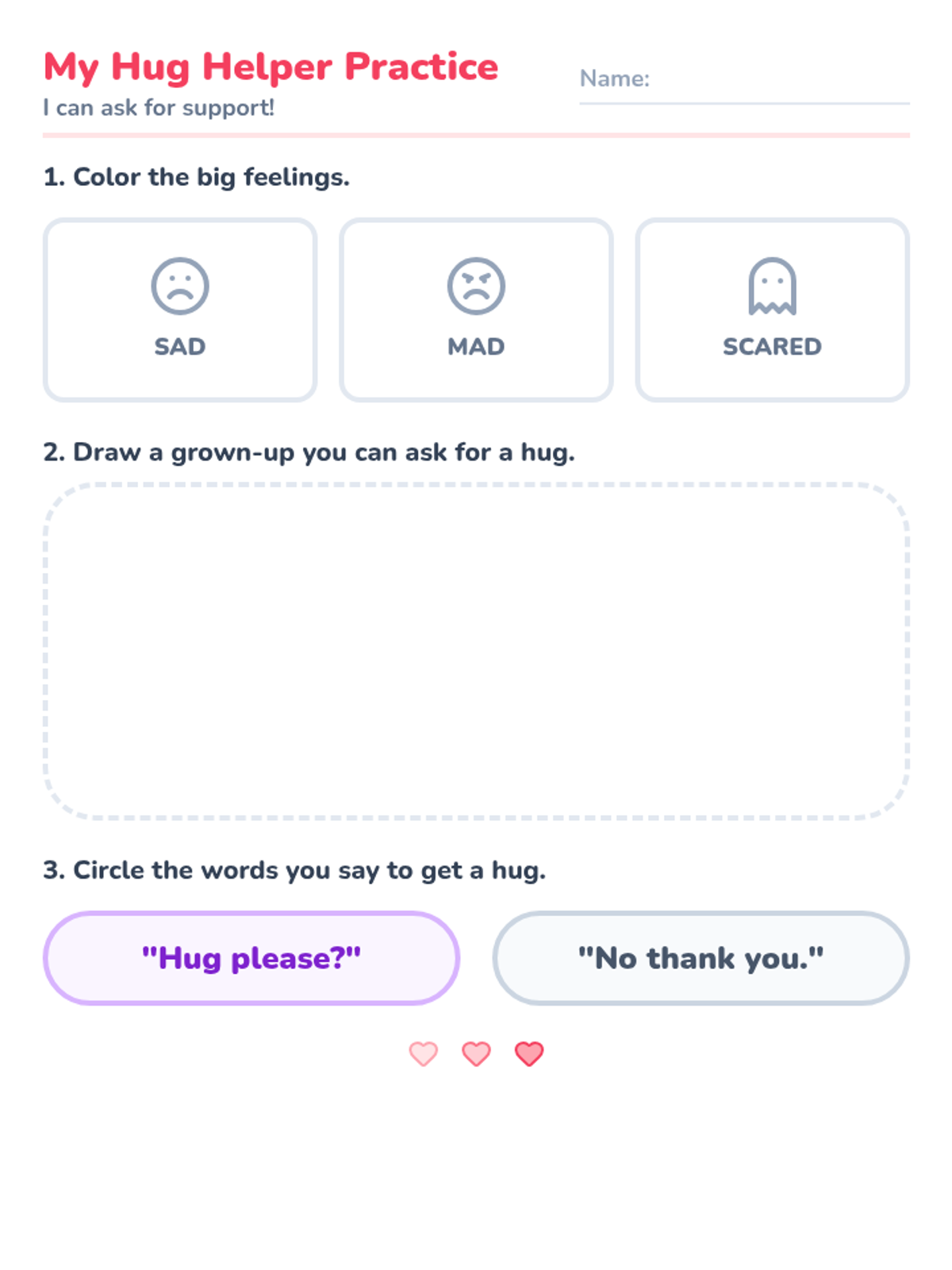 A single-page student activity sheet where preschool students can identify big feelings by coloring, draw their trusted grown-up, and practice identifying the verbal request for a hug. Revised to fit on one page with clear instructions.