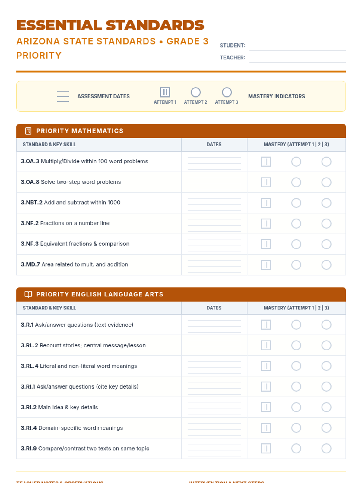 A single-page Arizona Essential Standards Mastery Tracker combining priority Math and ELA standards. Features a gold 'Essential' theme and the consistent 3-attempt tracking system for focused progress monitoring.