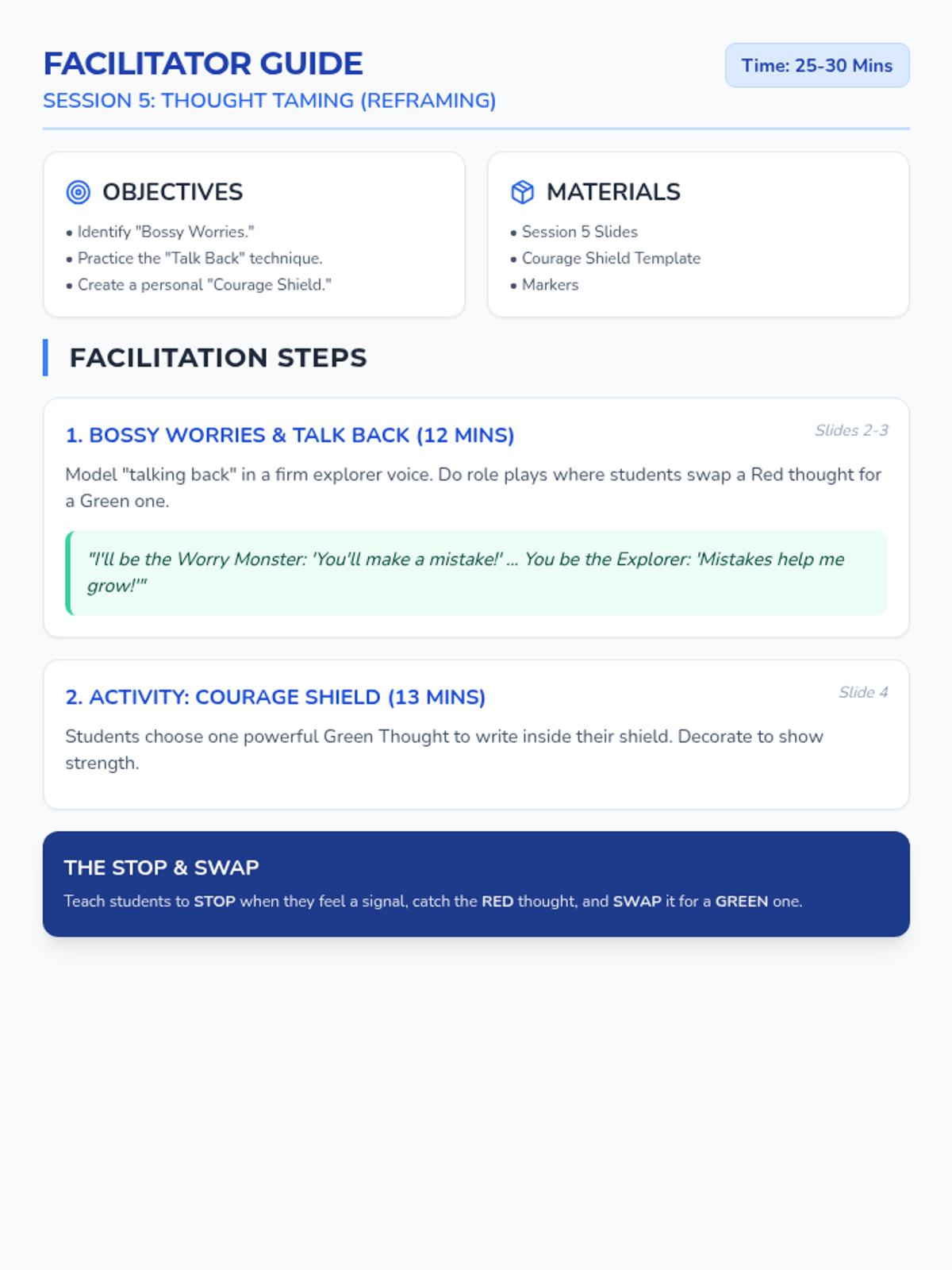 Slide deck for Session 5, teaching students how to 'talk back' to their worry monster and use positive reframing (The Courage Shield).