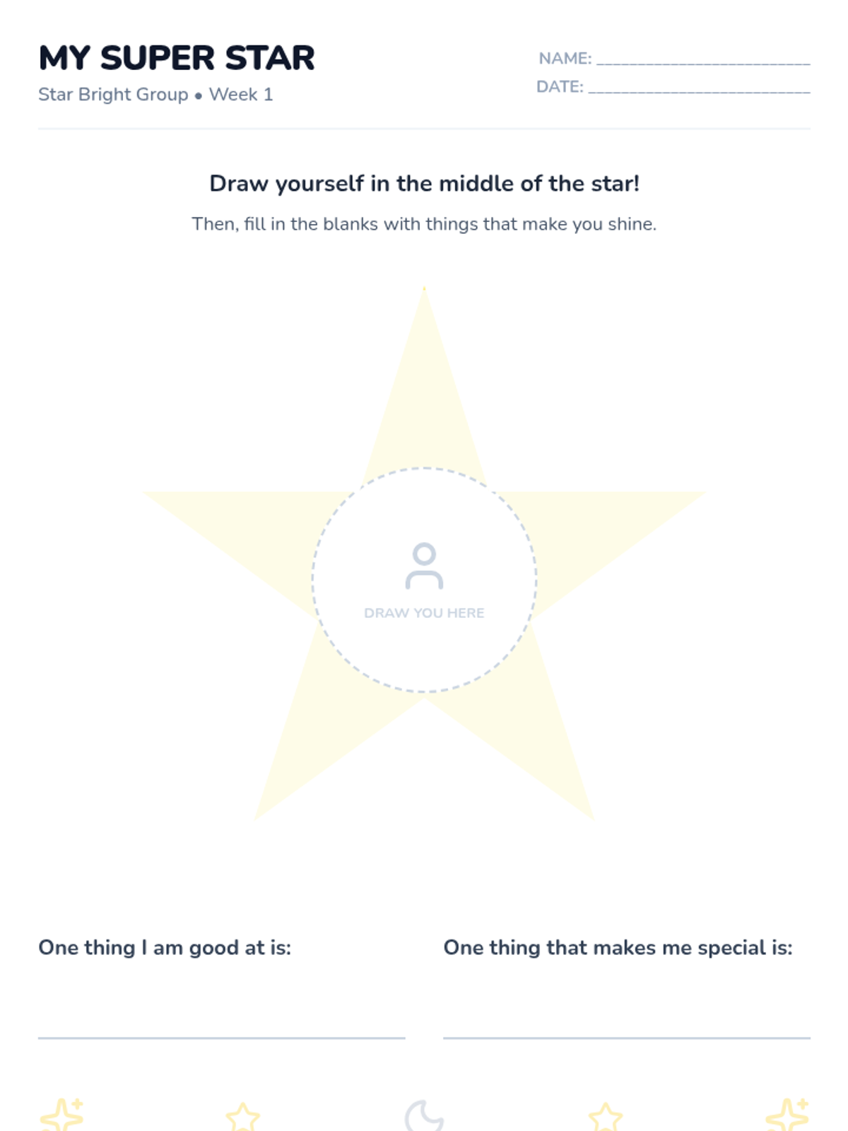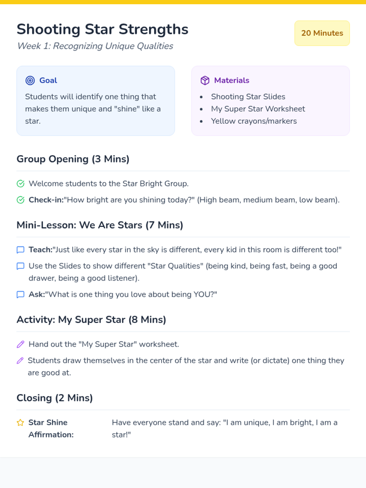 A comprehensive teacher guide for the first week of the Star Bright self-esteem group, featuring a 20-minute lesson plan focused on recognizing unique qualities. Revised for improved spacing and instructional clarity.