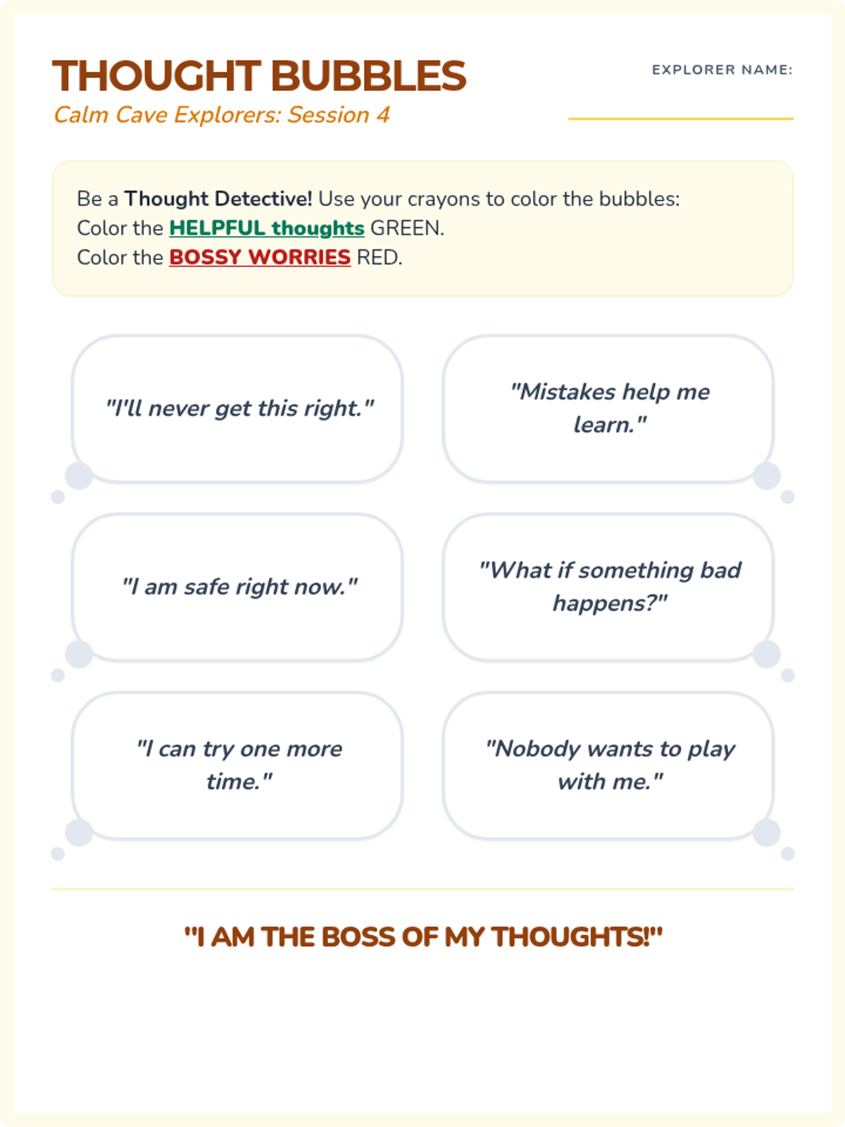A sorting worksheet for 2nd graders to distinguish between unhelpful and helpful thoughts. Fixes: Resolved page break cut-off at the bottom, improved instruction clarity, increased Name field visibility, and standardized bubble tails.