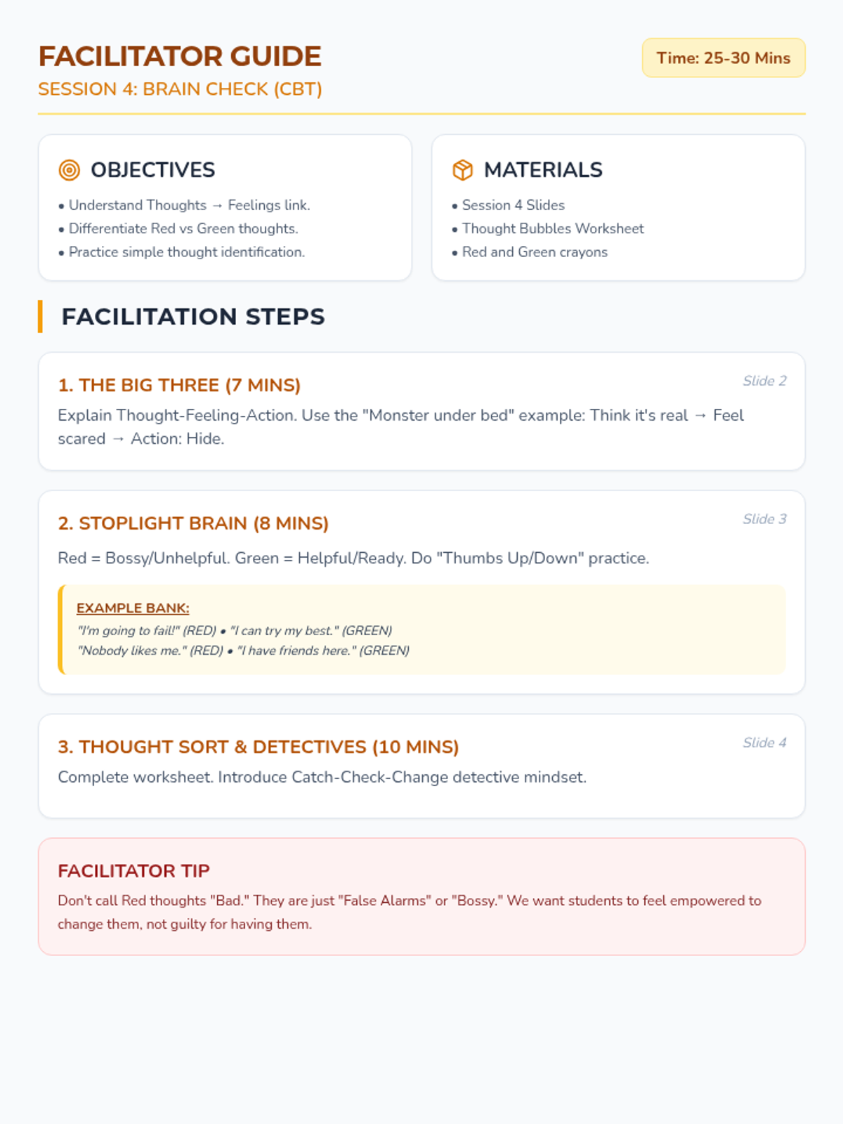 Facilitator guide for Session 4. Fixes: Resolved page break splitting the Example Bank and tightened layout to fit on one page.