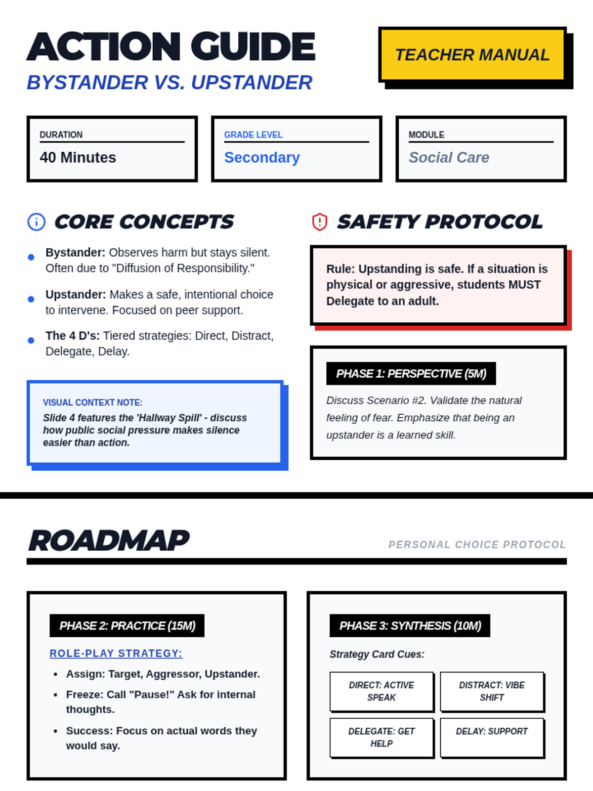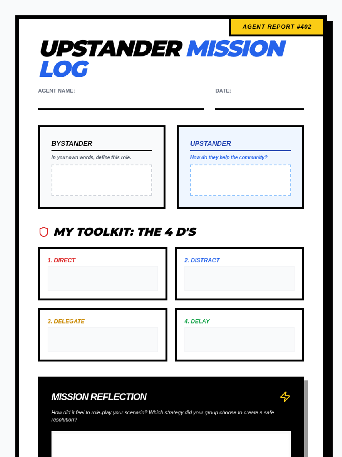 A visually striking student worksheet using a bold graphic novel / comic book aesthetic. It includes sections for defining roles, mapping intervention strategies, and reflecting on the role-play activity with improved writing space and added role-play success tips. Fixes page-break and contrast issues.