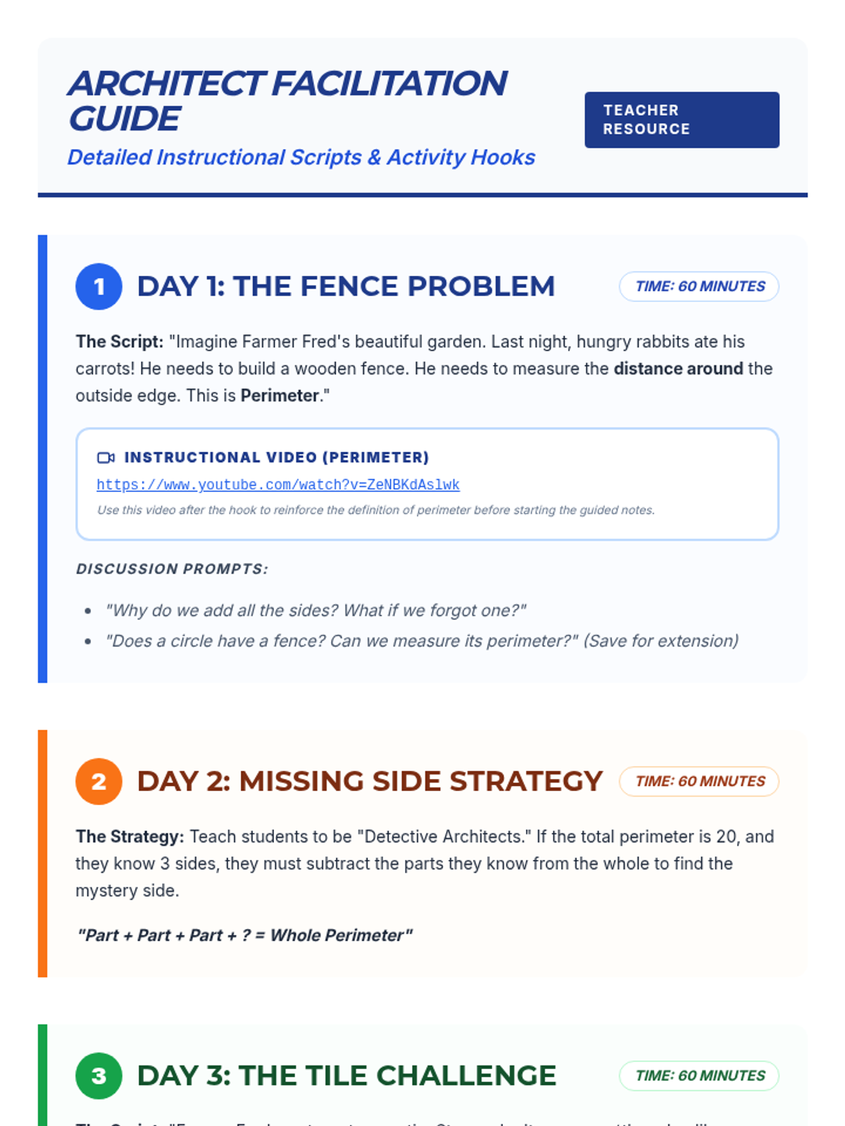 A detailed instructional guide for teachers providing scripts for daily lesson hooks, specifically explaining "The Fence Problem" and other architect-themed scenarios for perimeter and area. Includes timing markers and video reference links.