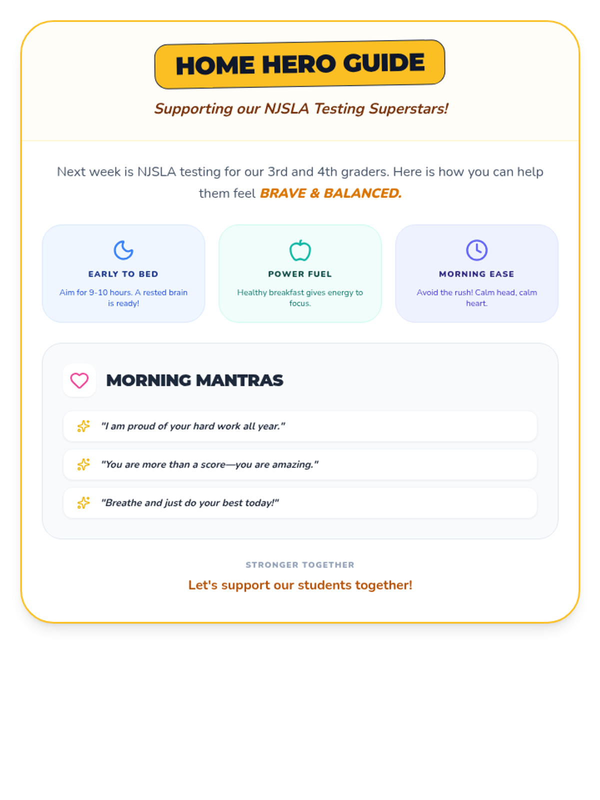 A helpful and supportive flyer for parents and guardians featuring tips for home preparation, morning routines, and positive affirmations to support students during NJSLA week.