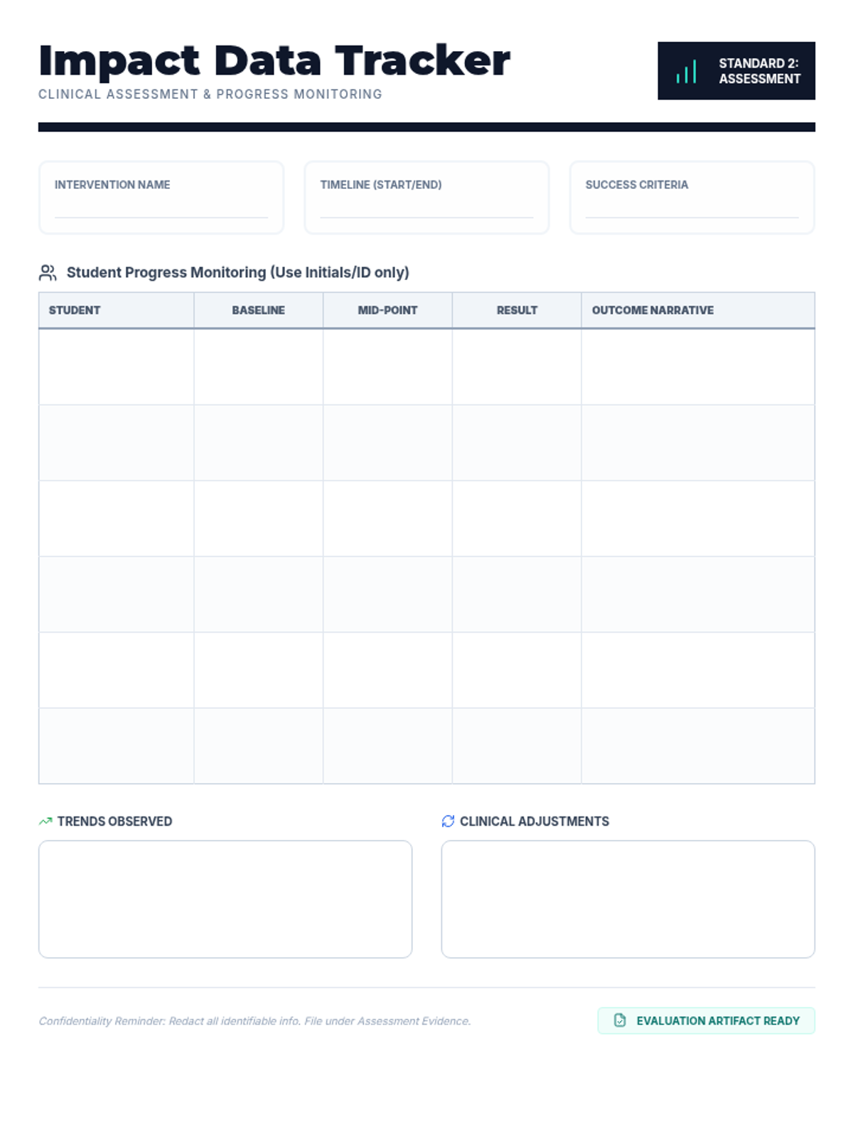 A professional data tracking sheet for school social workers to record pre and post-intervention outcomes, trends, and instructional adjustments as evidence for assessment standards.