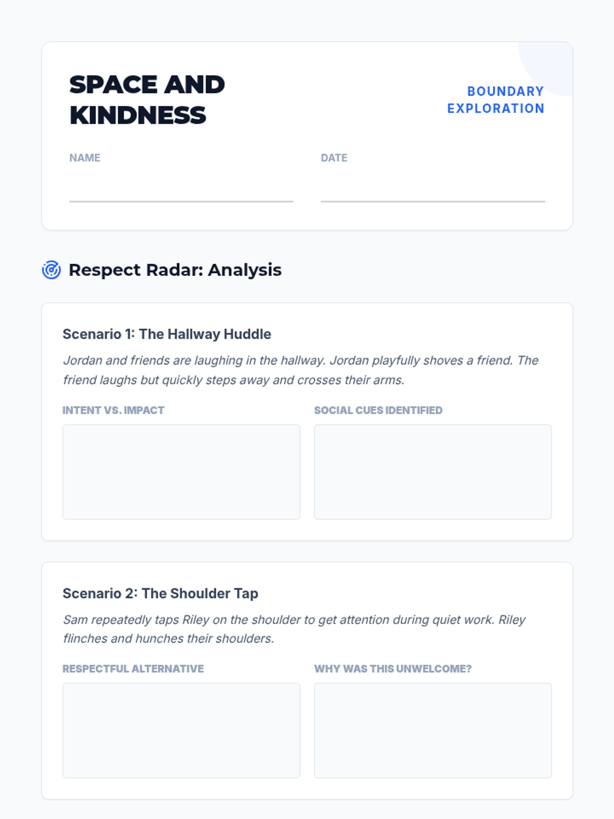 A middle school worksheet featuring social scenarios for analysis and a reflective action plan for practicing physical boundaries and kindness.