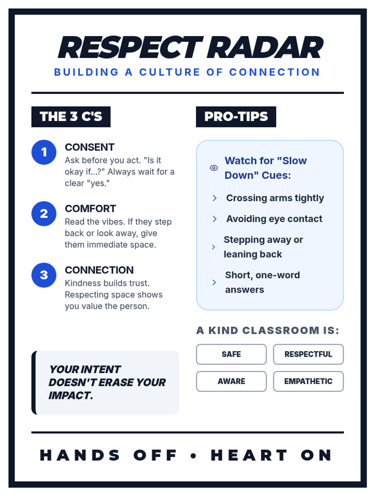 A high-impact anchor chart for middle school classrooms defining personal boundaries and social cues for respectful physical interactions.