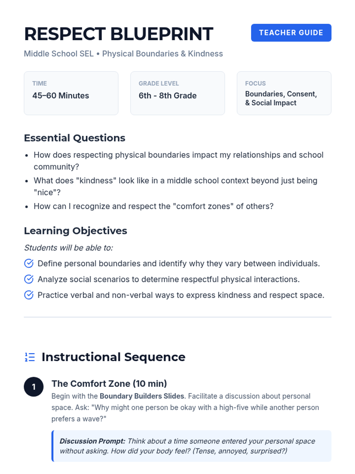 A detailed lesson plan for middle school teachers focusing on physical boundaries, consent, and kindness in a social context. Includes timing, objectives, and specific instructional activities.