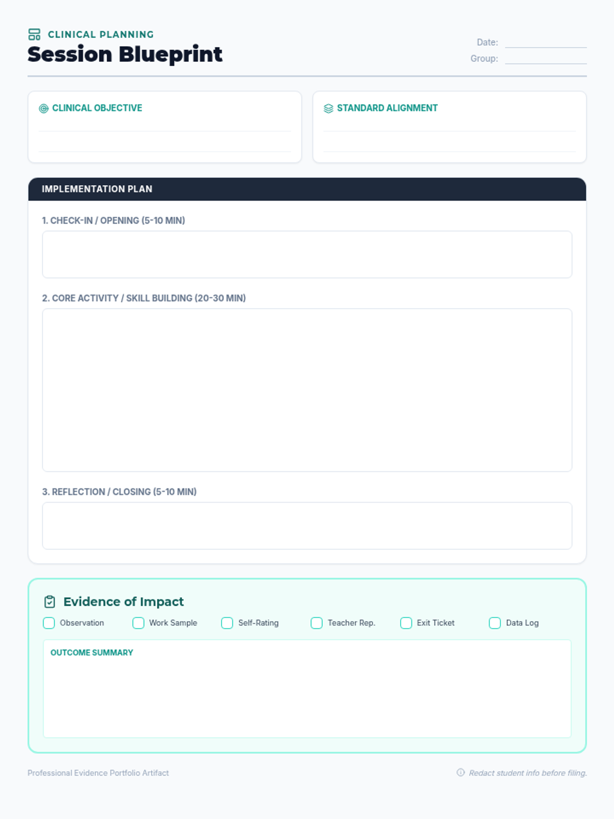 A planning template for social work sessions that ensures clinical work is documented in a way that satisfies both therapeutic needs and educator evaluation standards for design and assessment.