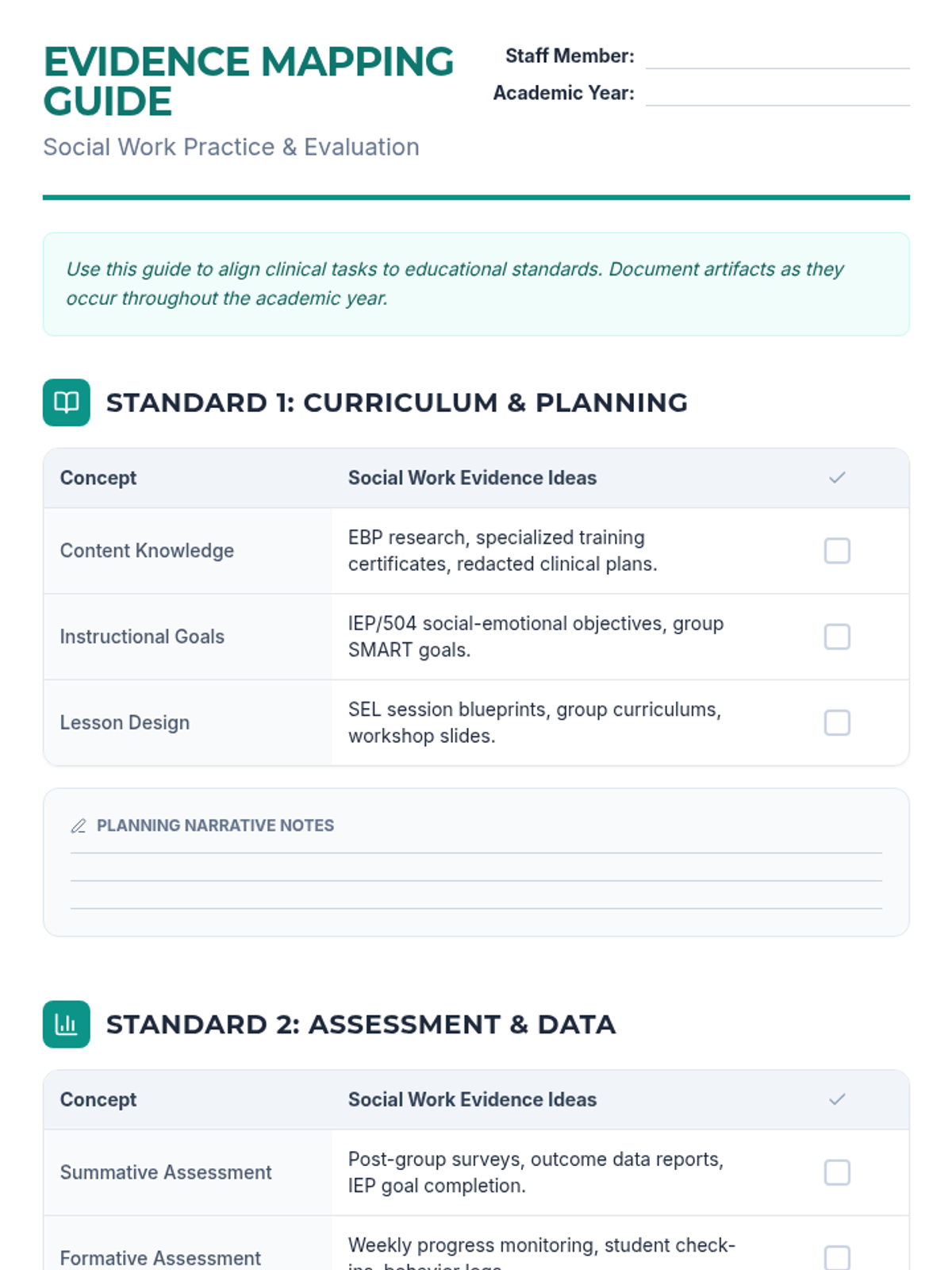 A practical guide for social workers to map their clinical work to evaluation standards, providing a checklist and cross-walk table for artifact collection.