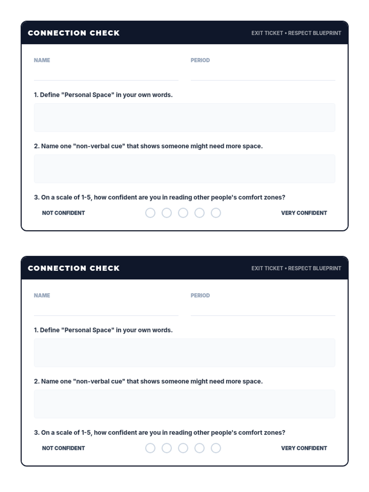 A double-up printable exit ticket for middle school students to assess their understanding of personal space and social cues.