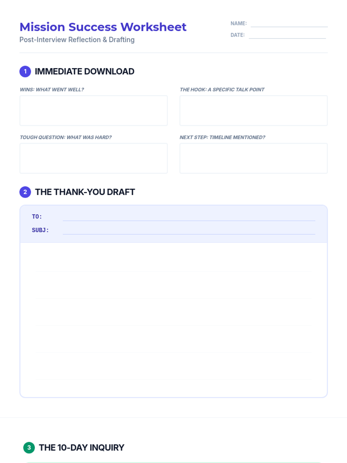 A dual-purpose worksheet for reflection and writing practice, featuring sections for interview debriefing, drafting thank-you emails, and writing follow-up inquiries with a peer-review checklist.