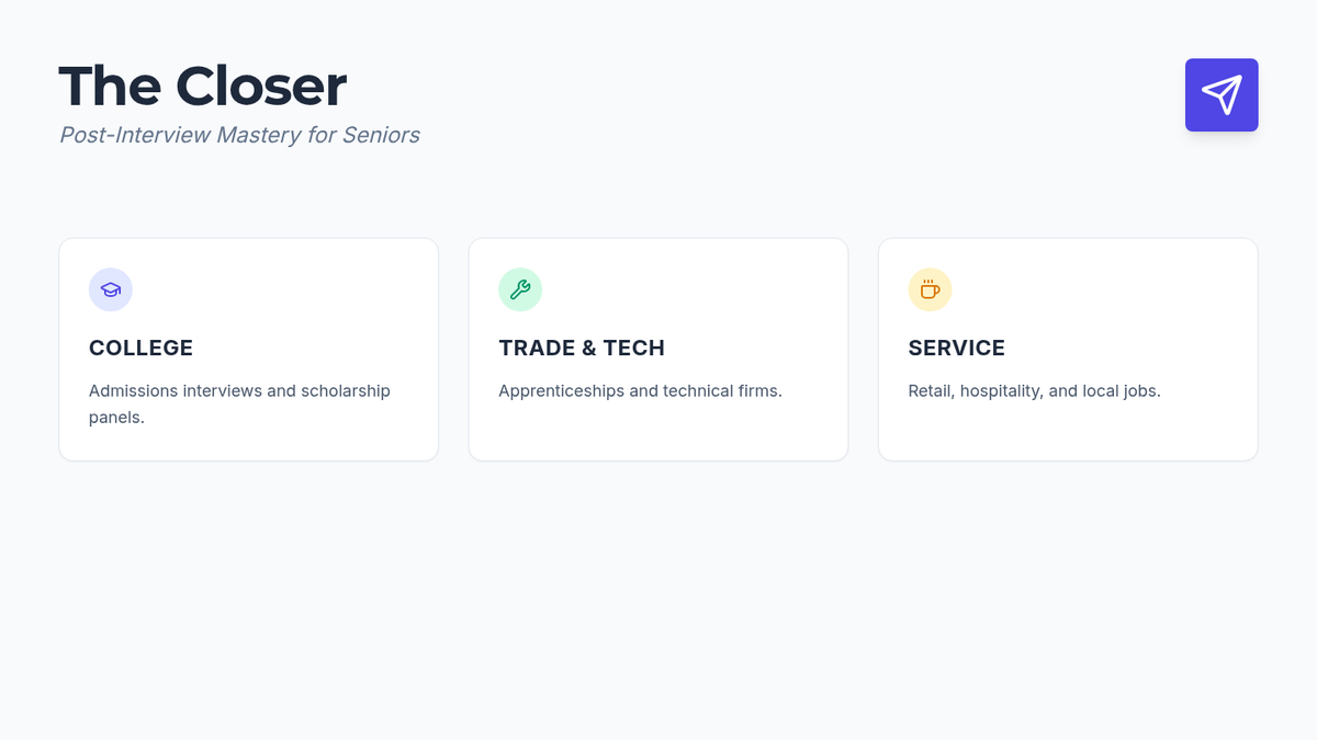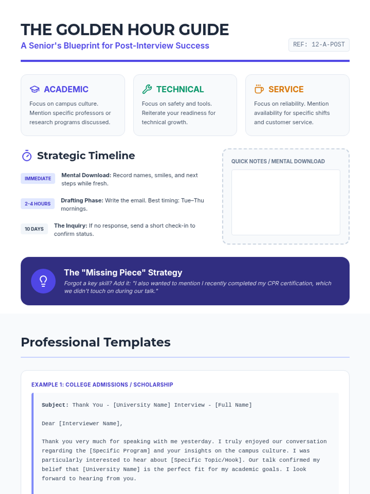 A professional reference sheet for high school seniors detailing the "Golden 24 Hours" post-interview, with tailored advice for academic, technical, and service paths, including full email templates.