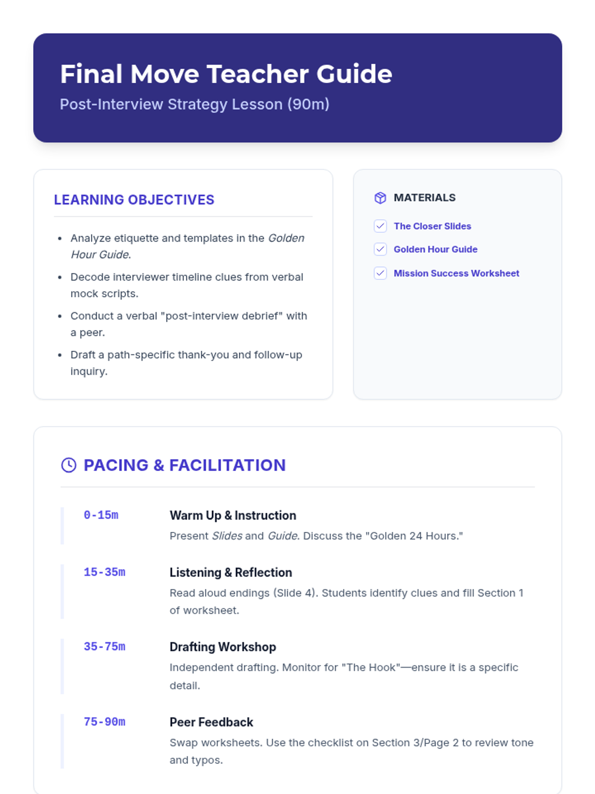A teacher's facilitation guide for a 90-minute lesson on post-interview skills, including lesson pacing, activity instructions, and path-specific tips for college, trade, and service interviews.