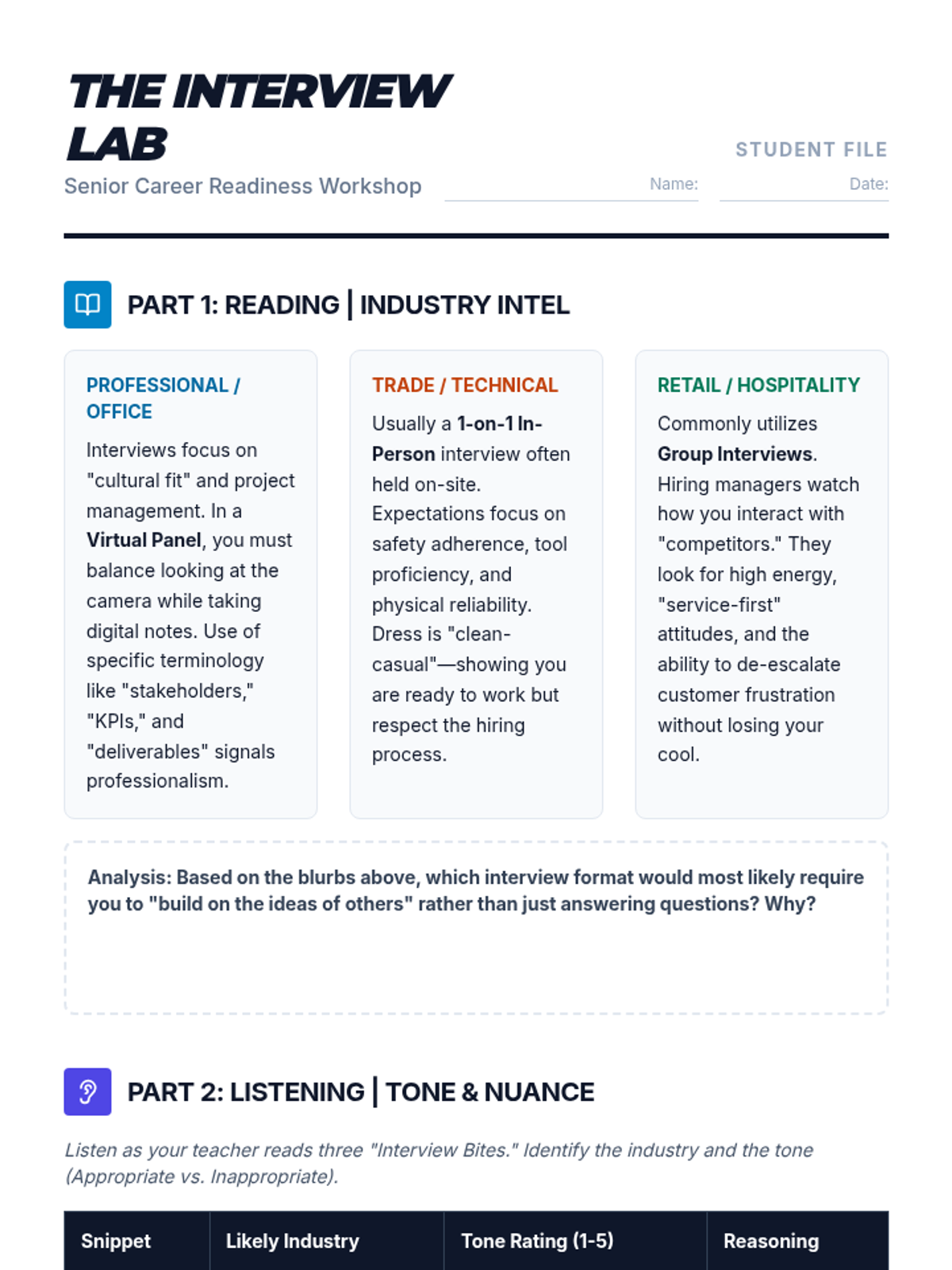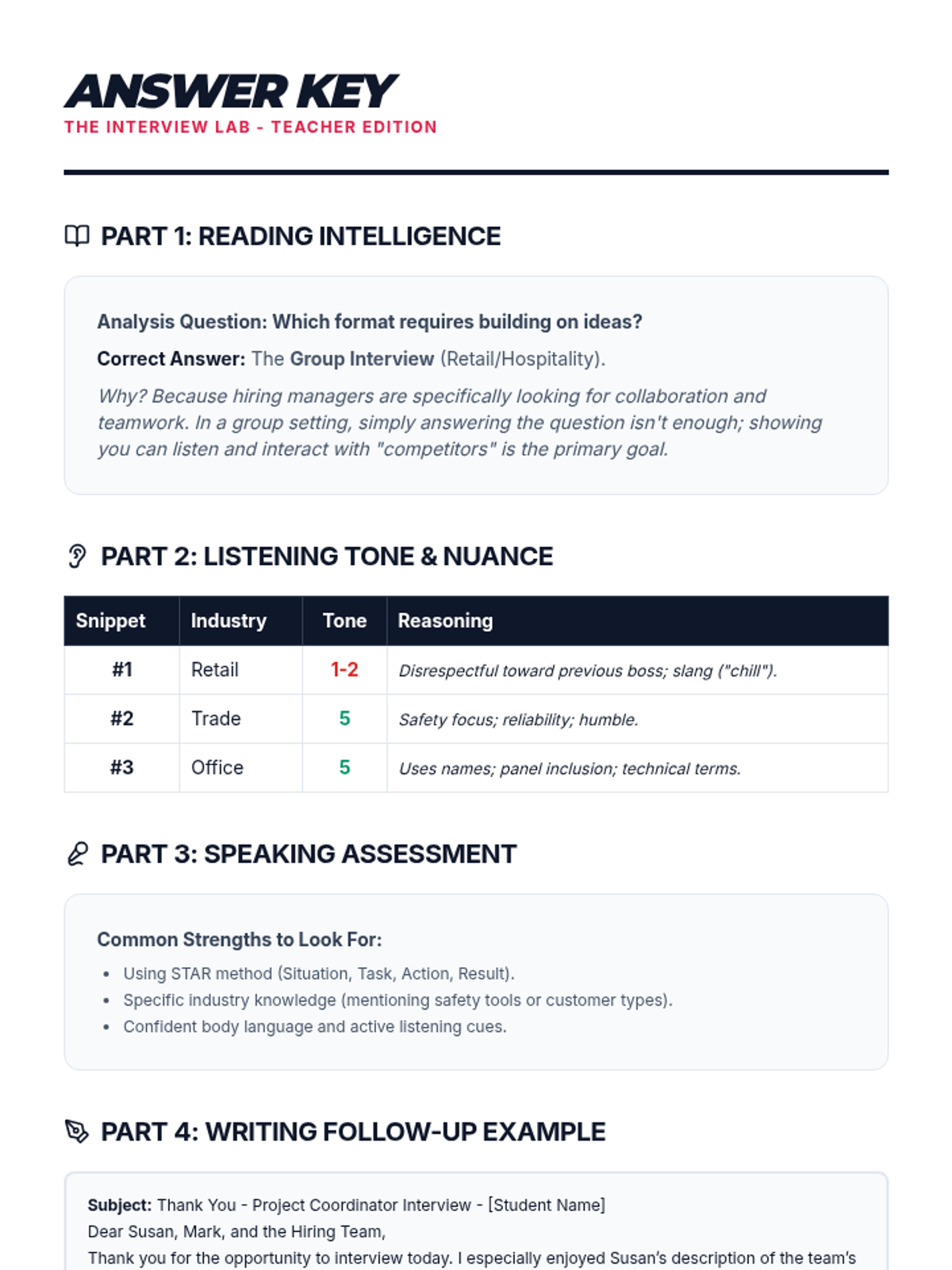 A complete answer key for the Interview Lab Workbook, featuring suggested responses, tone ratings, and industry identifications. Now including missing Part 3 and fixed page breaks.