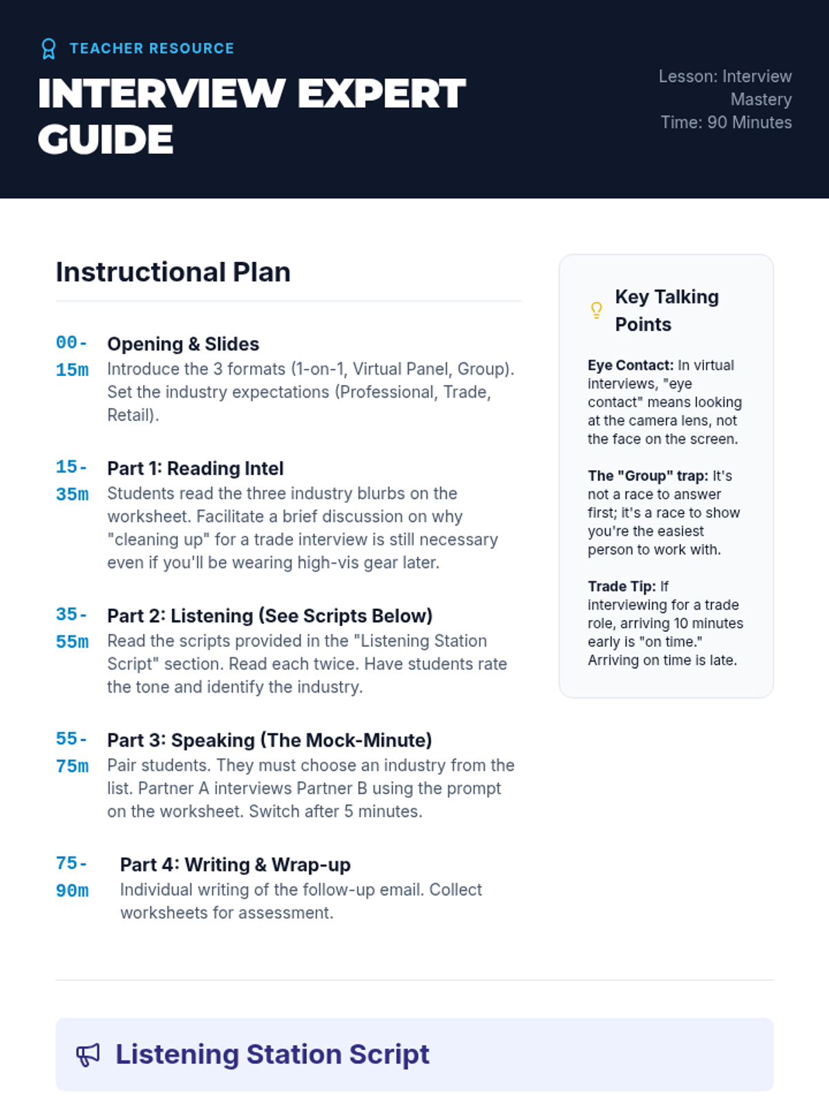 A detailed instructional guide for teachers, including a 90-minute lesson timeline, talking points, and the required scripts for the listening portion of the student worksheet. Updated with fixed HTML and layout.