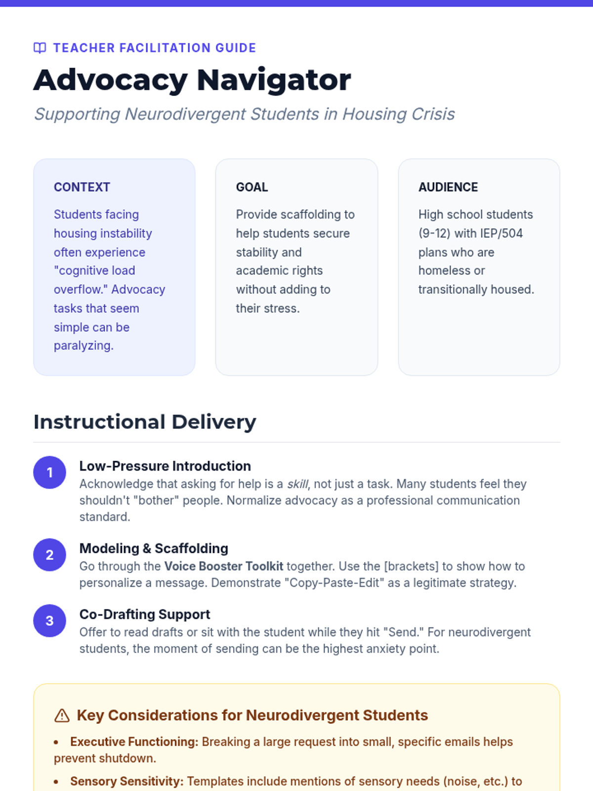 A teacher-facing facilitation guide providing instructional strategies, background information on McKinney-Vento rights, and discussion prompts for supporting neurodivergent students in housing crisis.