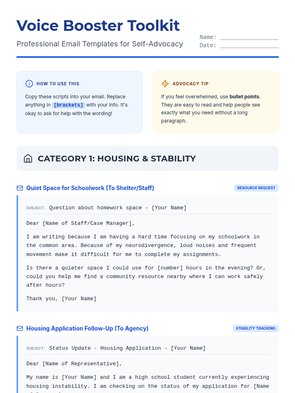 A comprehensive student-facing toolkit featuring professional email templates for advocating for housing resources, IEP/504 accommodations, and school-related financial waivers. Includes specific strategies for neurodivergent students to communicate effectively despite environmental instability.