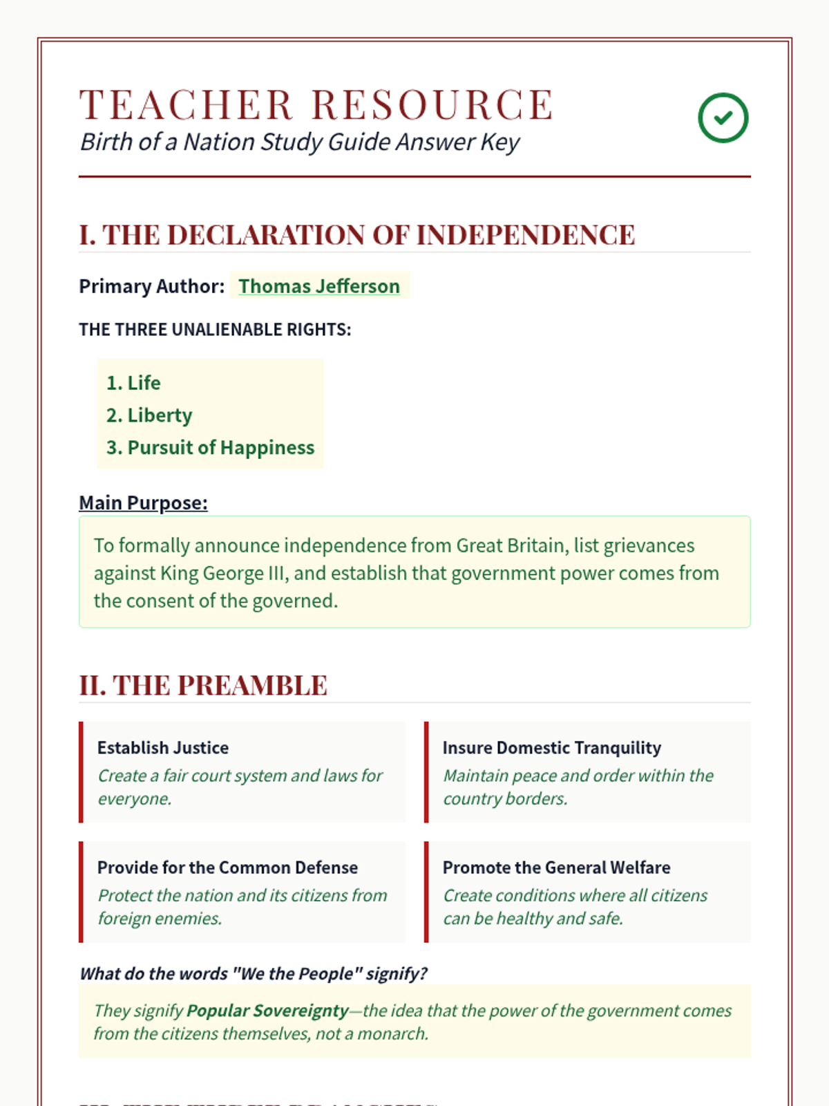 An answer key for the Birth of a Nation Study Guide, providing clear, concise answers for teachers to use during review or for grading. Highlights key terms and essential concepts in history.