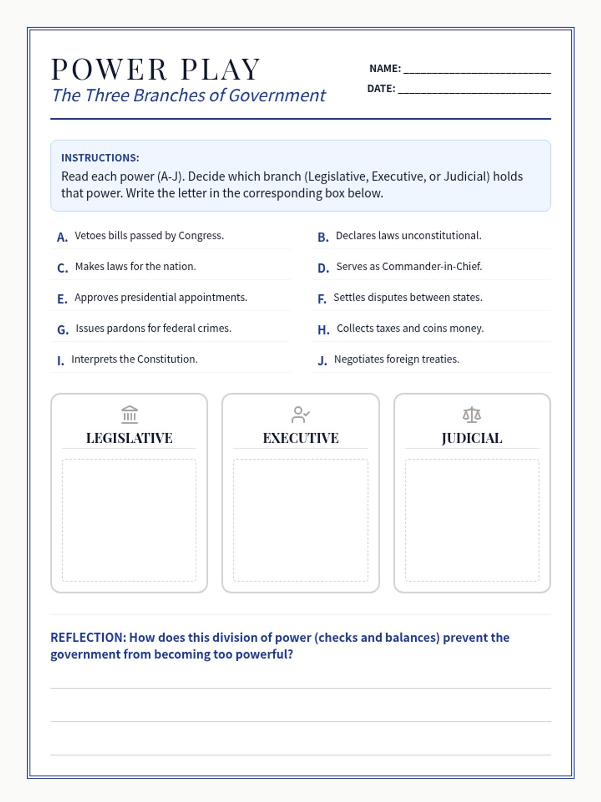 A classification worksheet where students assign specific constitutional powers to the Legislative, Executive, and Judicial branches of the U.S. government. Includes a short-answer reflection on the separation of powers.