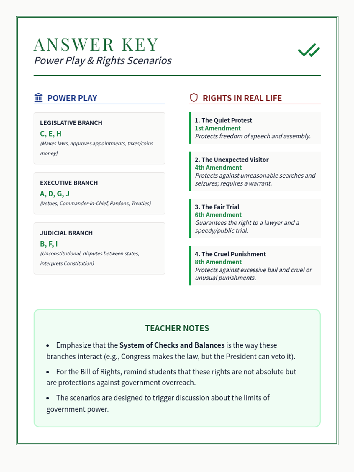 A combined teacher answer key and instructional guide for the Power Play and Rights in Real Life worksheets. Includes specific amendment identifications and branch power classifications.