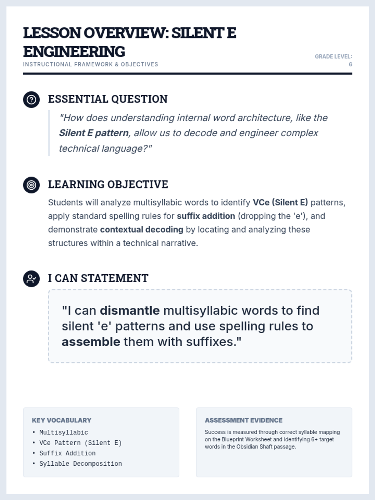 A teacher-facing reference document outlining the essential question, learning objective, and 'I can' statement for the Silent E Engineering lesson.