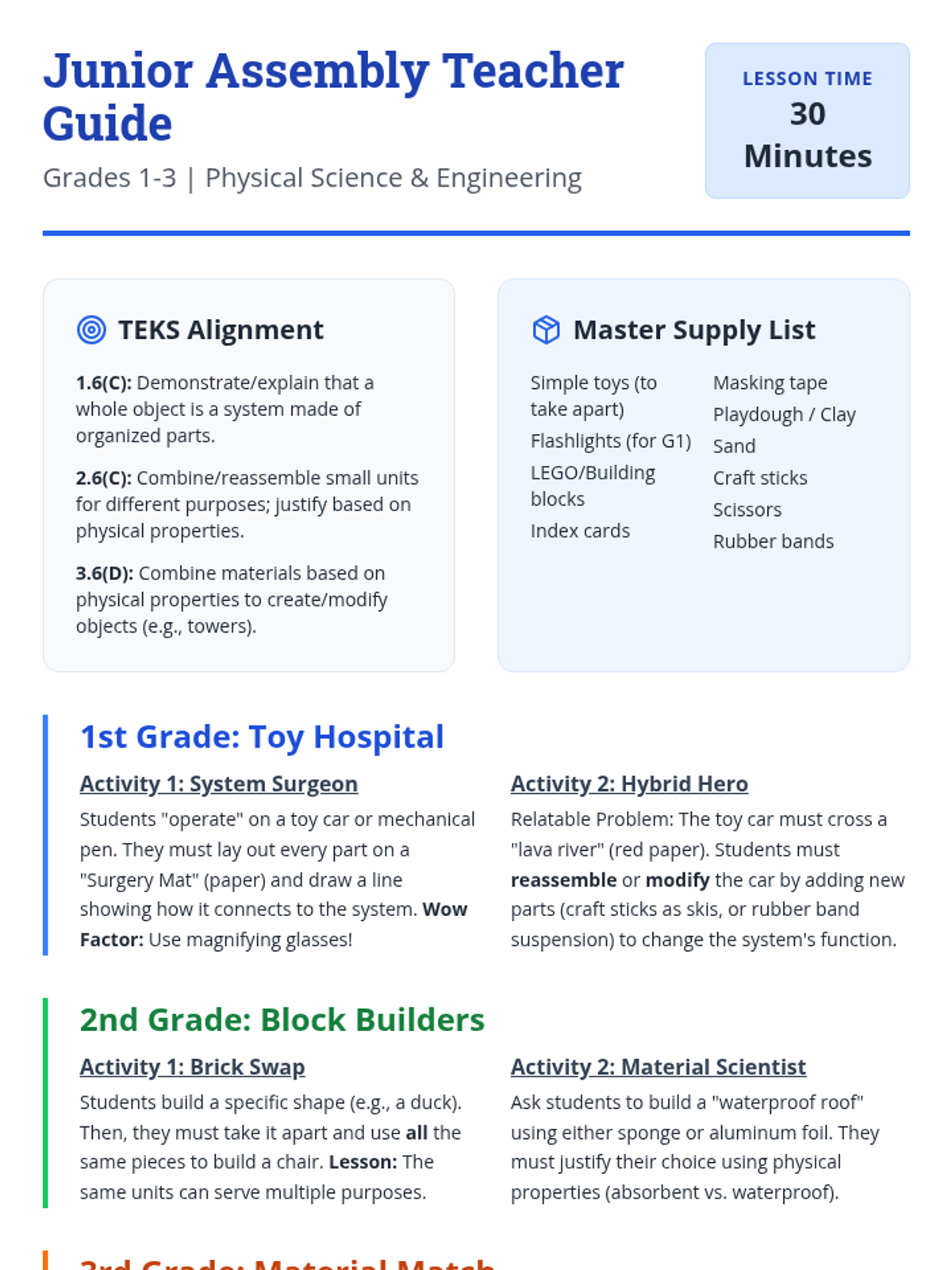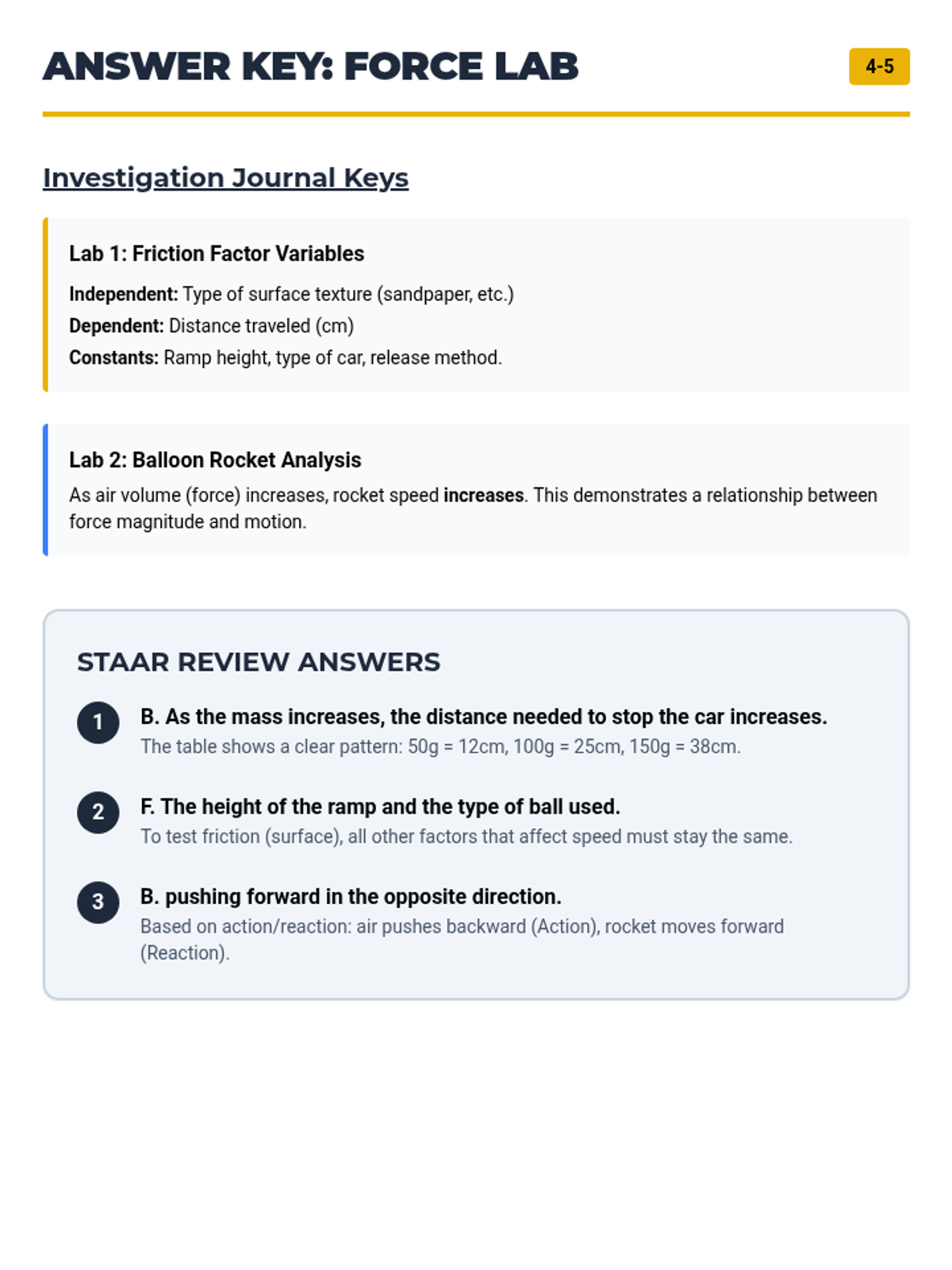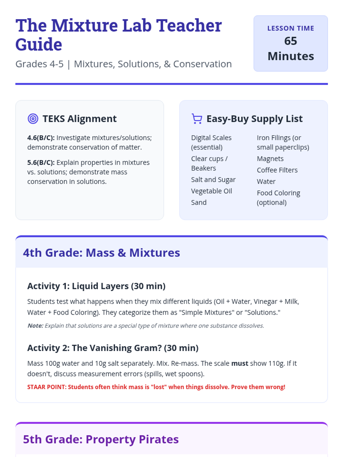A detailed teacher facilitation guide for the 'Mixture Lab' lesson (Grades 4-5). It provides TEKS alignments, a master supply list, 65-minute lesson pacing, step-by-step activity instructions for four advanced STEM labs, and a STAAR-focused answer key.