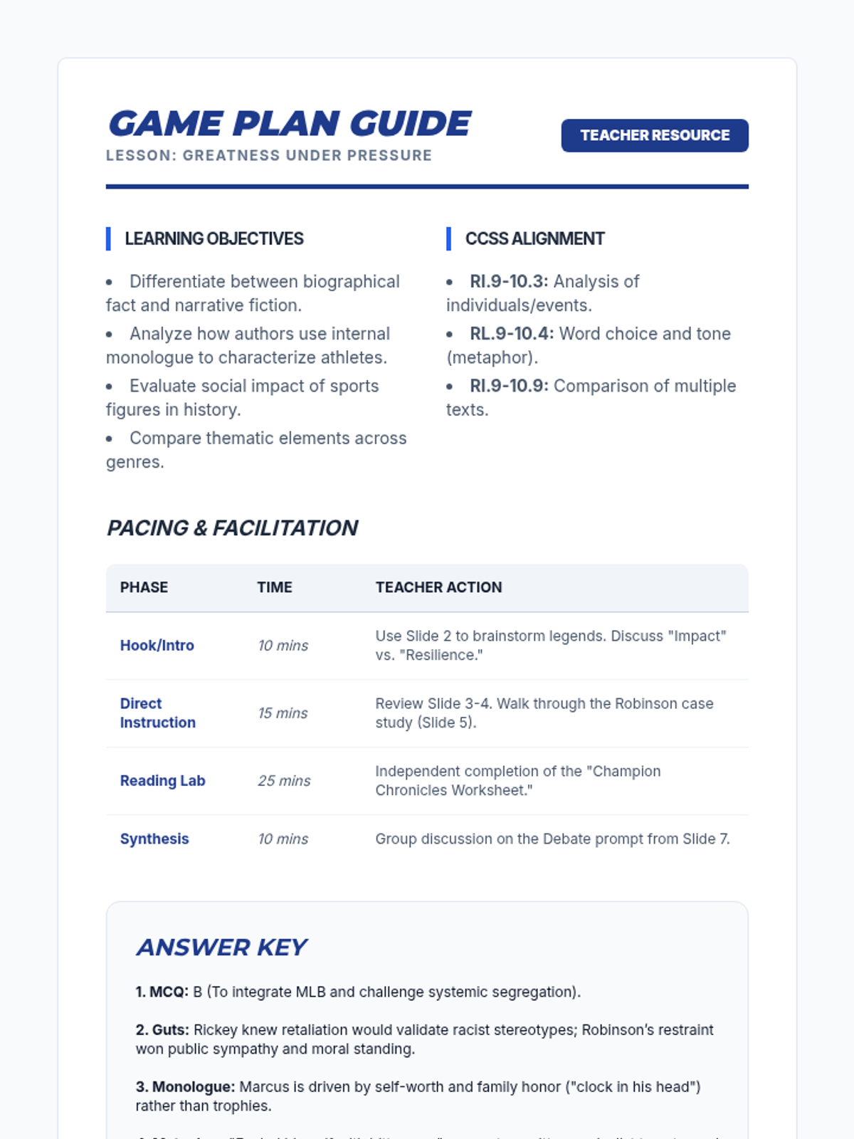 A comprehensive teacher guide for the "Greatness Under Pressure" lesson, including CCSS alignment, a pacing guide, detailed answer keys, and discussion facilitation tips.