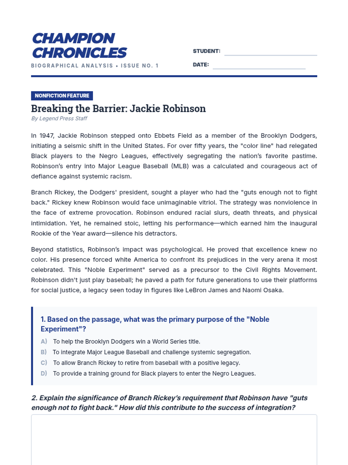 A 3-page reading comprehension worksheet featuring a nonfiction biography of Jackie Robinson and a fictional narrative about an elite runner. Includes multiple-choice and critical-thinking questions focused on theme, character motivation, and comparative analysis.