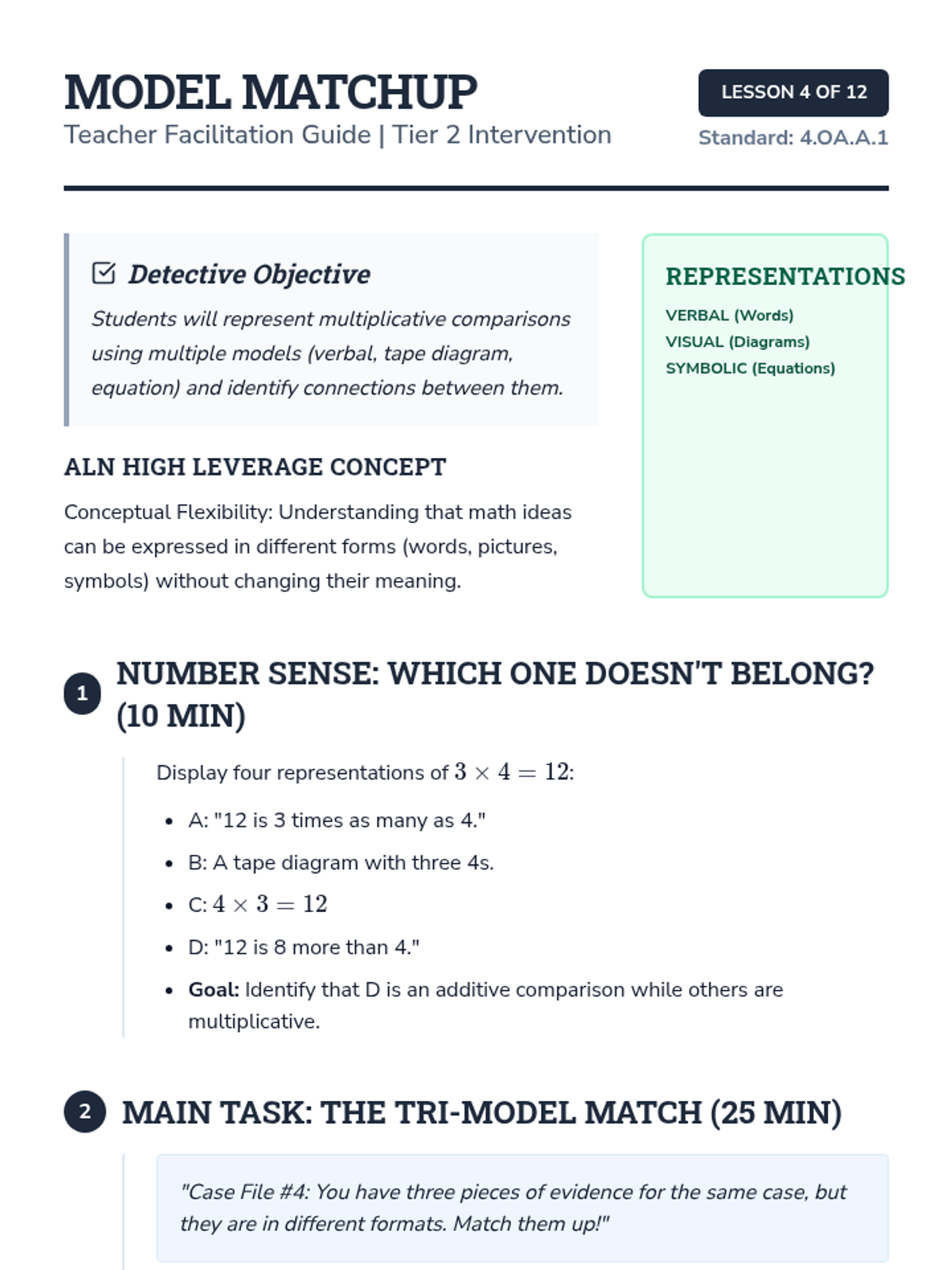 Teacher facilitation guide for Lesson 4, focusing on connecting verbal, visual, and symbolic representations of multiplicative comparisons.
