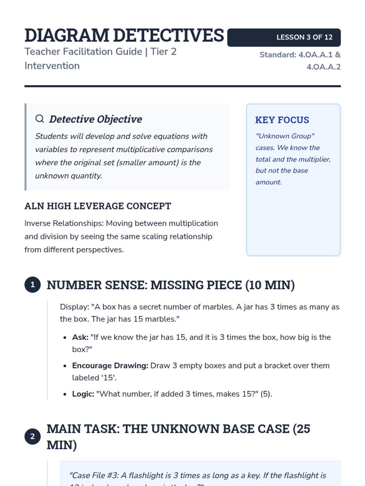 Teacher facilitation guide for Lesson 3, focusing on multiplicative comparison problems where the base amount is unknown (requiring division).