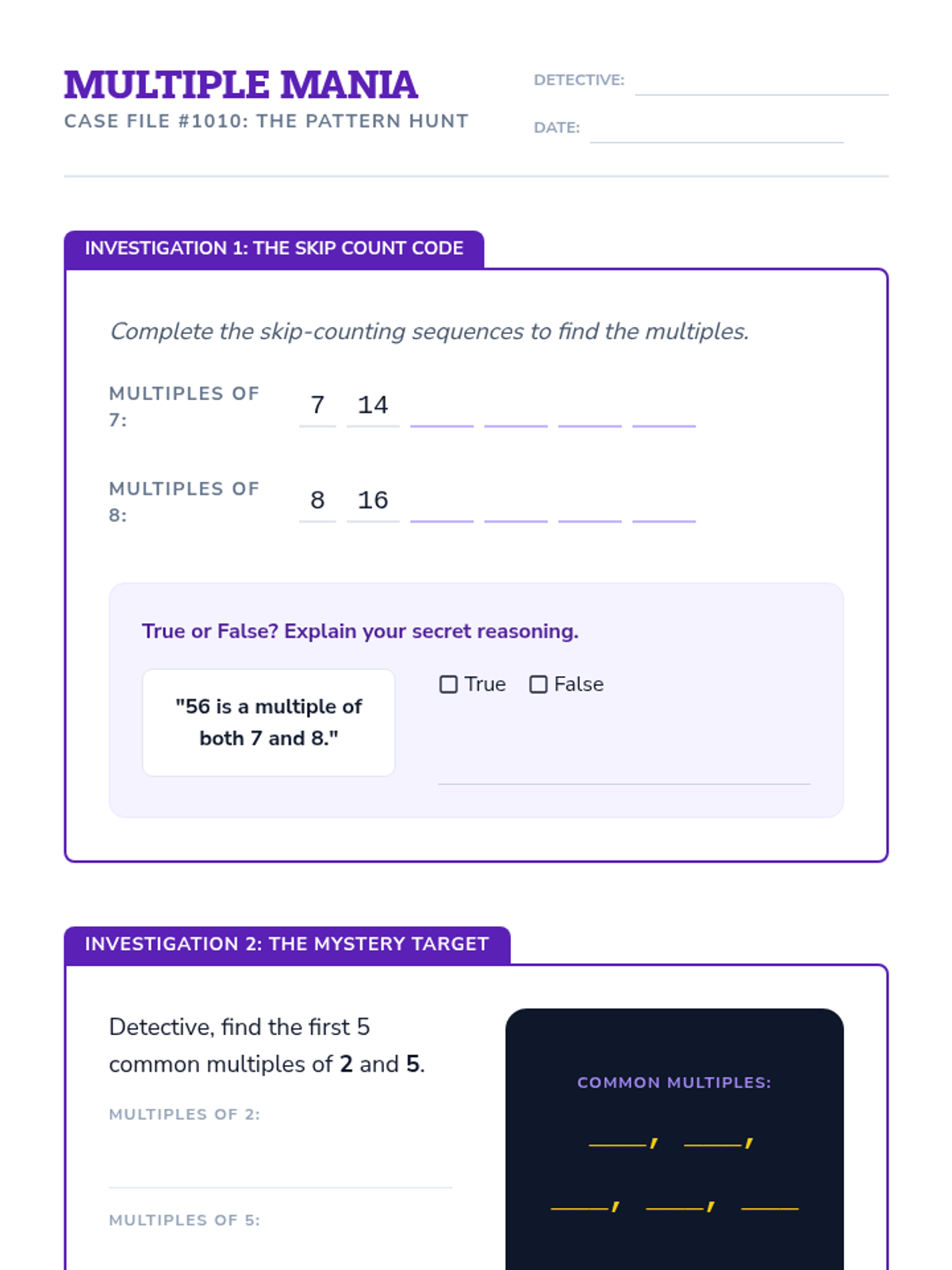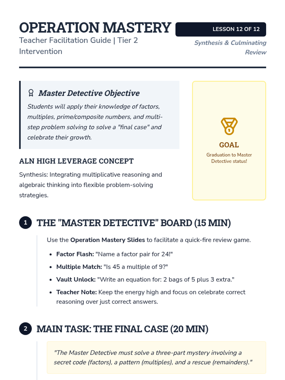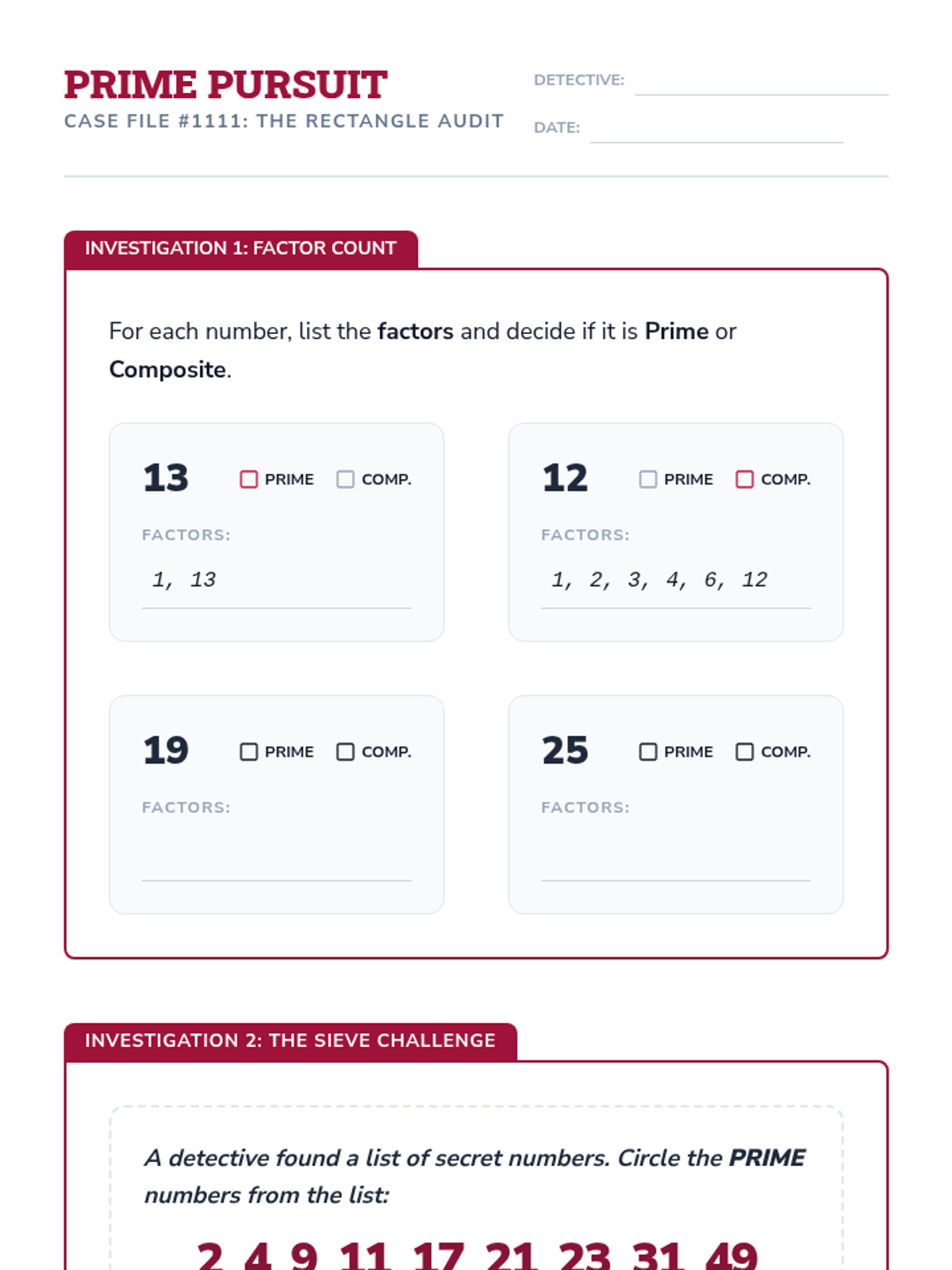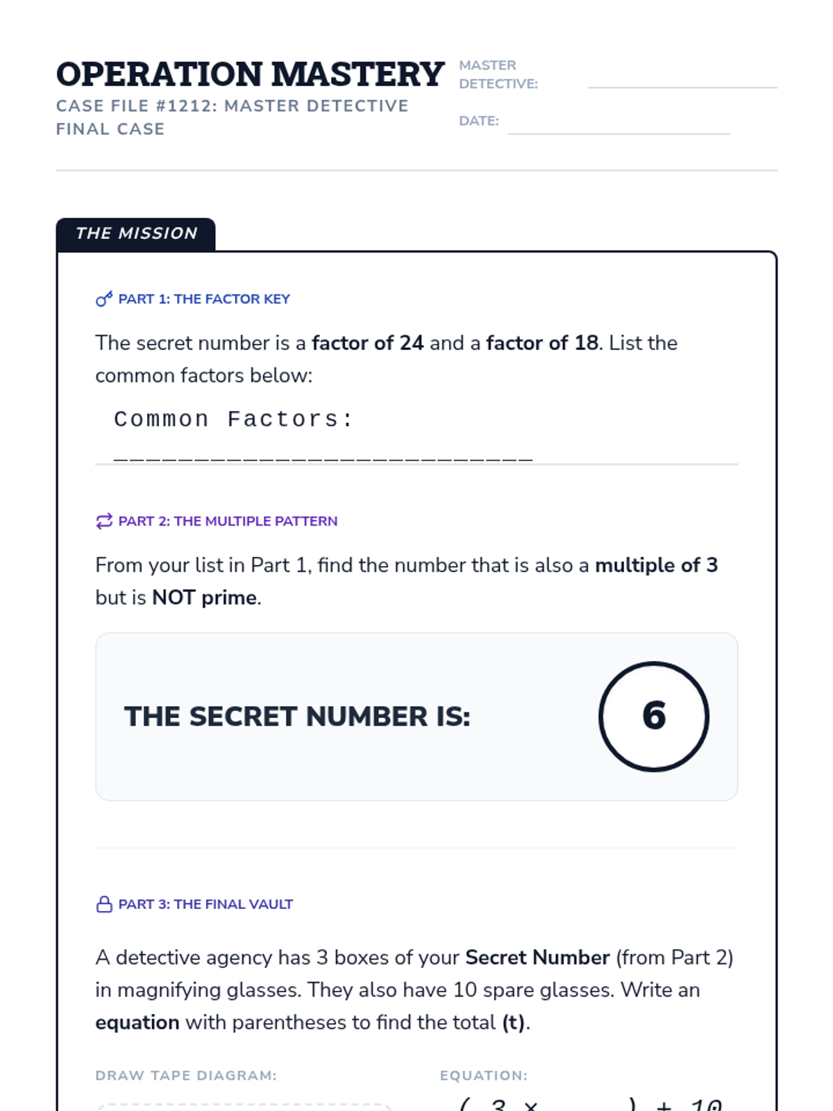 Final synthesis activity for Lesson 12, featuring a three-part mystery that requires students to apply their knowledge of factors, multiples, prime numbers, and equations.
