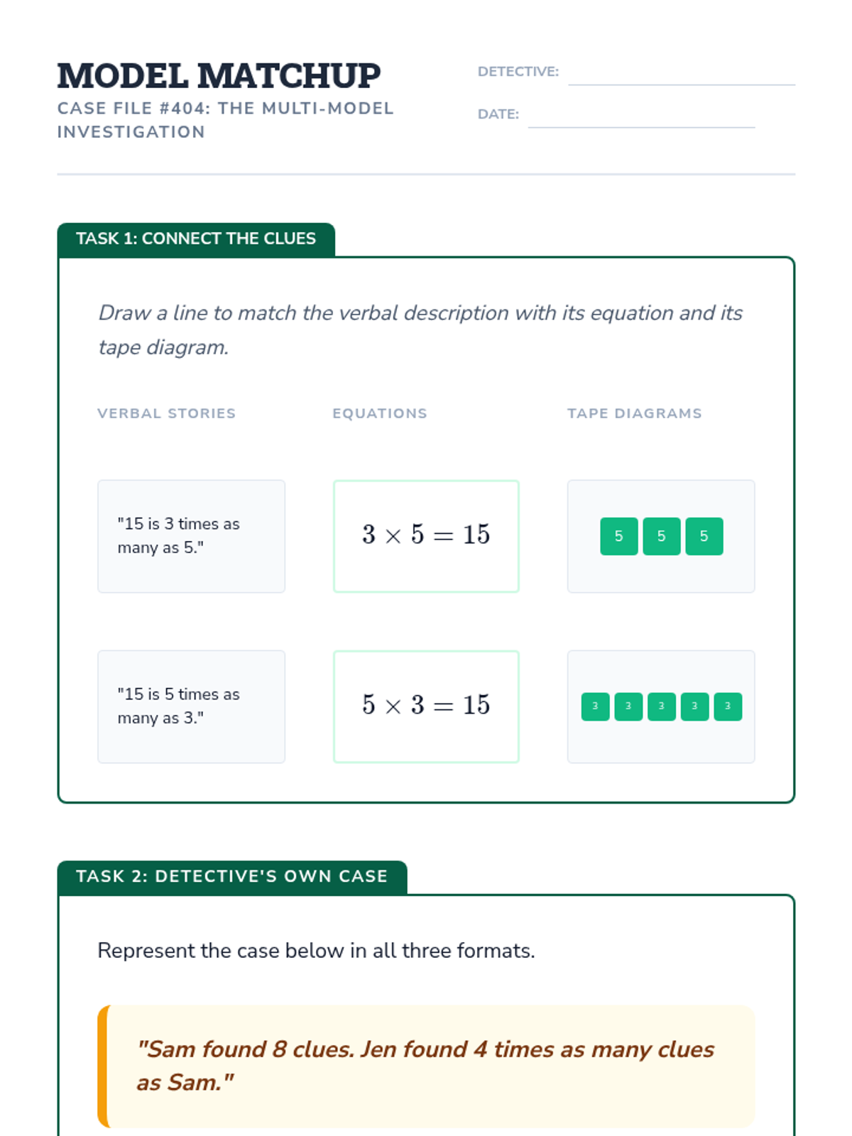 Student worksheet for Lesson 4, where students match different representations of multiplicative comparisons and create their own models.
