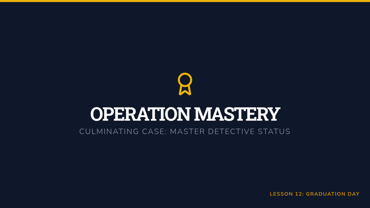 Slide deck for the final Lesson 12, celebrating student progress and presenting a "Final Mystery" challenge to synthesize all learned concepts.