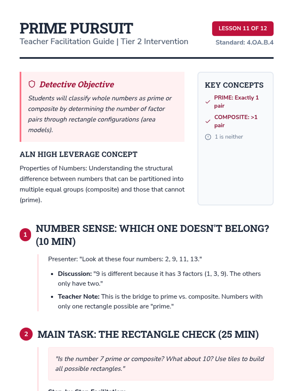 Teacher facilitation guide for Lesson 11, focusing on the structural differences between prime and composite numbers using area models.
